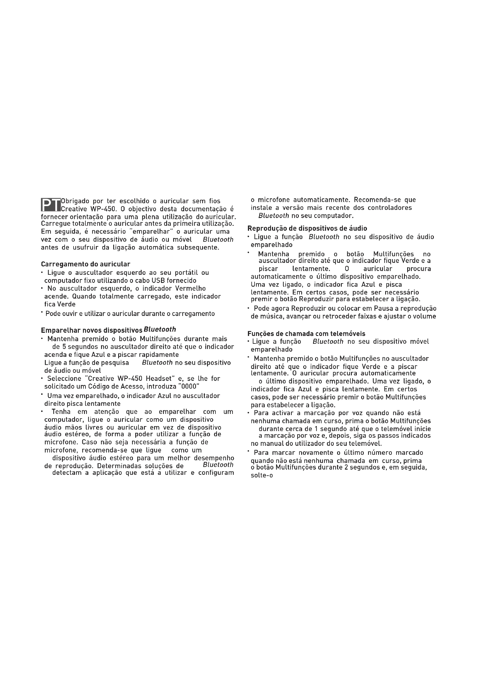 - Nettogewicht: 114gPT Obrigado por ter escolhido o auricular sem fios Creative WP-450. O objectivo desta documentação é fornecer orientação para uma plena utilização do auricular. Carregue totalmente o auricular antes da primeira utilização. Em seguida, é necessário “emparelhar” o auricular uma vez com o seu dispositivo de áudio ou móvel Bluetooth antes de usufruir da ligação automática subsequente. Carregamento do auricular