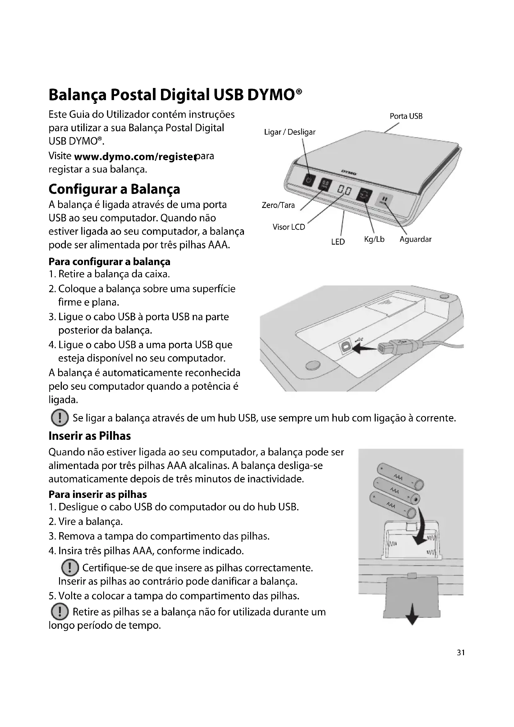 Visite www.dymo.com/register para registar a sua balança. Configurar a Balança A balança é ligada através de uma porta USB ao seu computador. Quando não estiver ligada ao seu computador, a balança pode ser alimentada por três pilhas AAA. Para configurar a balança