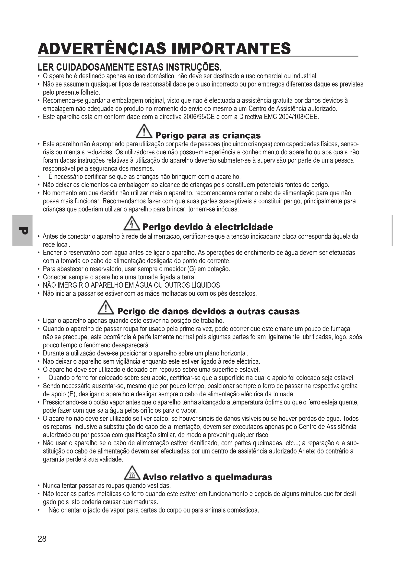 - O aparelho é destinado apenas ao uso doméstico, não deve ser destinado a uso comercial ou industrial. • Não se assumem quaisquer tipos de responsabilidade pelo uso incorrecto ou por empregos diferentes daqueles previstes pelo presente folheto. • Recomenda-se guardar a embalagem original, visto que não é efectuada a assistência gratuita por danos devidos à embalagem não adequada do produto no momento do envio do mesmo a um Centro de Assistência autorizado. • Este aparelho está em conformidade com a directiva 2006/95/CE e com a Directiva EMC 2004/108/CEE. Perigo para as crianças