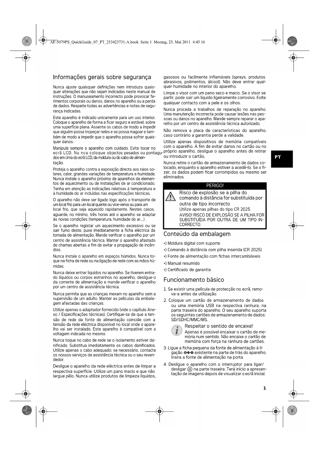 desligar B na parte traseira. Terá início a apresen- tação de imagens depois de visualizar o ecrã inicial. PERIGO! Risco de explosão se a pilha do comando à distância for substituída por outra de tipo incorrecto Utilize apenas pilhas do tipo CR 2025. AVISO! RISCO DE EXPLOSÃO SE A PILHA FOR SUBSTITUÍDA POR OUTRA DE UM TIPO IN- CORRECTO. Respeitar o sentido de encaixe! Apenas é possível encaixar o cartão de me- mória num sentido. Não encaixe o cartão de memória com força na ranhura de cartões. AF-5079PS_QuickGuide_07_PT_253423731-A.book Seite 1 Montag, 23. Mai 2011 4:45 162