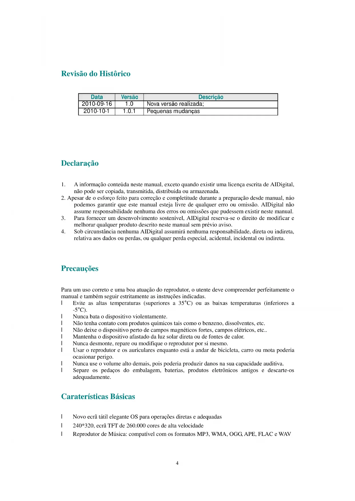relativa aos dados ou perdas, ou qualquer perda especial, acidental, incidental ou indireta. Precauções Para um uso correto e uma boa atuação do reprodutor, o utente deve compreender perfeitamente o manual e também seguir estritamente as instruções indicadas. l Evite as altas temperaturas (superiores a 35°C) ou as baixas temperaturas (inferiores a -5°C). l Nunca bata o dispositivo violentamente. l Não tenha contato com produtos químicos tais como o benzeno, dissolventes, etc. l Não deixe o dispositivo perto de campos magnéticos fortes, campos elétricos, etc.. l Mantenha o dispositivo afastado da luz solar direta ou de fontes de calor. l Nunca desmonte, repare ou modifique o reprodutor por si mesmo. l Usar o reprodutor e os auriculares enquanto está a andar de bicicleta, carro ou mota poderia ocasionar perigo. l Nunca use o volume alto demais, pois poderia produzir danos na sua capacidade auditiva. l Separe os pedaços do embalagem, baterias, produtos eletrônicos antigos e descarte-os adequadamente. Caraterísticas Básicas l Novo ecrã tátil elegante OS para operações diretas e adequadas l 240*320, ecrã TFT de 260.000 cores de alta velocidade l Reprodutor de Música: compatível com os formatos MP3, WMA, OGG, APE, FLAC e WAV Data