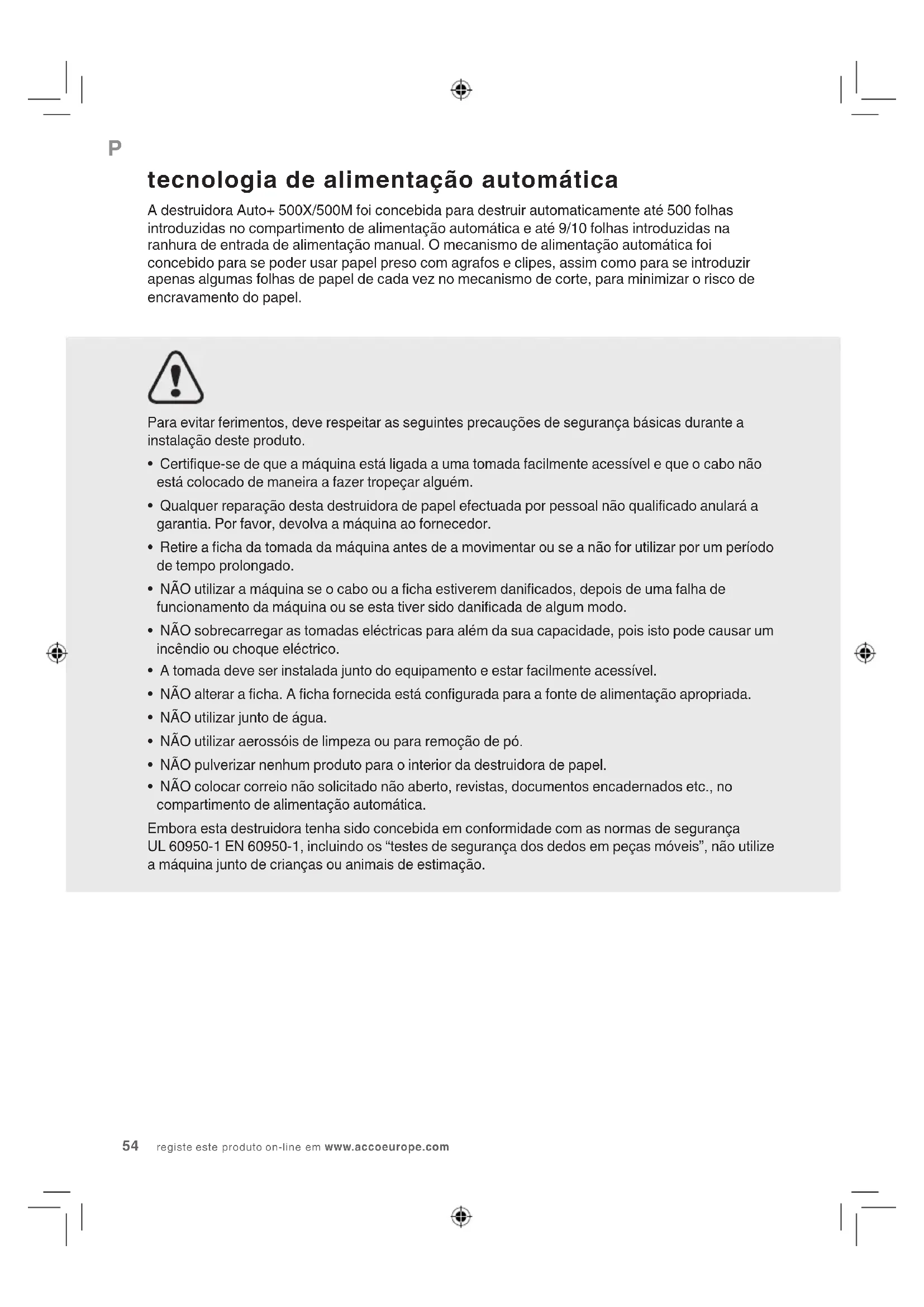 - NÃO colocar correio não solicitado não aberto, revistas, documentos encadernados etc., no compartimento de alimentação automática. Embora esta destruidora tenha sido concebida em conformidade com as normas de segurança UL 60950-1 EN 60950-1, incluindo os “testes de segurança dos dedos em peças móveis”, não utilize a máquina junto de crianças ou animais de estimação. tecnologia de alimentação automática A destruidora Auto+ 500X/500M foi concebida para destruir automaticamente até 500 folhas introduzidas no compartimento de alimentação automática e até 9/10 folhas introduzidas na ranhura de entrada de alimentação manual. O mecanismo de alimentação automática foi concebido para se poder usar papel preso com agrafos e clipes, assim como para se introduzir apenas algumas folhas de papel de cada vez no mecanismo de corte, para minimizar o risco de encravamento do papel.AUTO+ 500X&500M