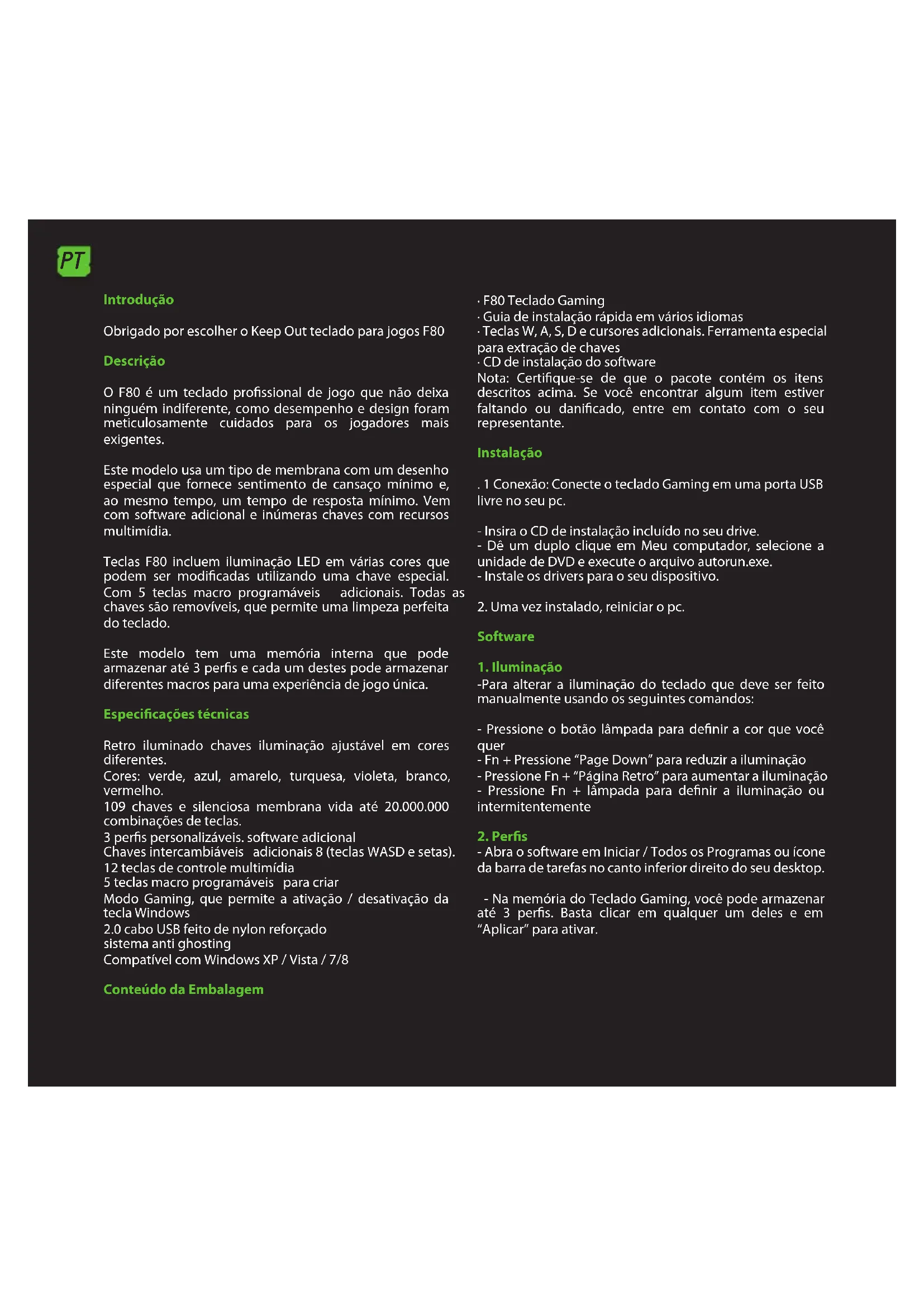 Możesz przywrócić ustawienia domyślne, klikając przycisk “Przywróć domyślne” na klawiaturze oprogramowania. Wsparcie techniczne Prosimy o więcej informacji na temat instalowania i kongurowania ten produkt na naszej stronie internetowej www.keep-out.eu lub napisać e-maila na adres: support@ keep-out.euPT Introdução Obrigado por escolher o Keep Out teclado para jogos F80 Descrição O F80 é um teclado prossional de jogo que não deixa ninguém indiferente, como desempenho e design foram meticulosamente cuidados para os jogadores mais exigentes. Este modelo usa um tipo de membrana com um desenho especial que fornece sentimento de cansaço mínimo e, ao mesmo tempo, um tempo de resposta mínimo. Vem com software adicional e inúmeras chaves com recursos multimídia. Teclas F80 incluem iluminação LED em várias cores que podem ser modicadas utilizando uma chave especial. Com 5 teclas macro programáveis adicionais. Todas as chaves são removíveis, que permite uma limpeza perfeita do teclado. Este modelo tem uma memória interna que pode armazenar até 3 pers e cada um destes pode armazenar diferentes macros para uma experiência de jogo única. Especicações técnicas Retro iluminado chaves iluminação ajustável em cores diferentes. Cores: verde, azul, amarelo, turquesa, violeta, branco, vermelho. 109 chaves e silenciosa membrana vida até 20.000.000 combinações de teclas. 3 pers personalizáveis. software adicional Chaves intercambiáveis adicionais 8 (teclas WASD e setas). 12 teclas de controle multimídia 5 teclas macro programáveis para criar Modo Gaming, que permite a ativação / desativação da tecla Windows