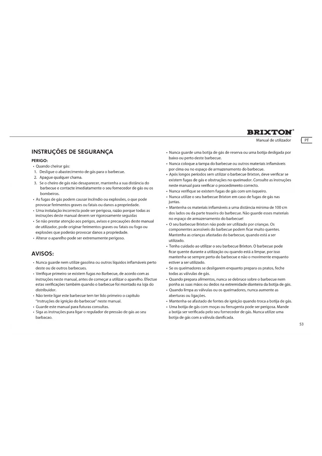 - Após longos períodos sem utilizar o barbecue Brixton, deve vericar se existem fugas de gás e obstruções no queimador. Consulte as instruções neste manual para vericar o procedimento correcto.