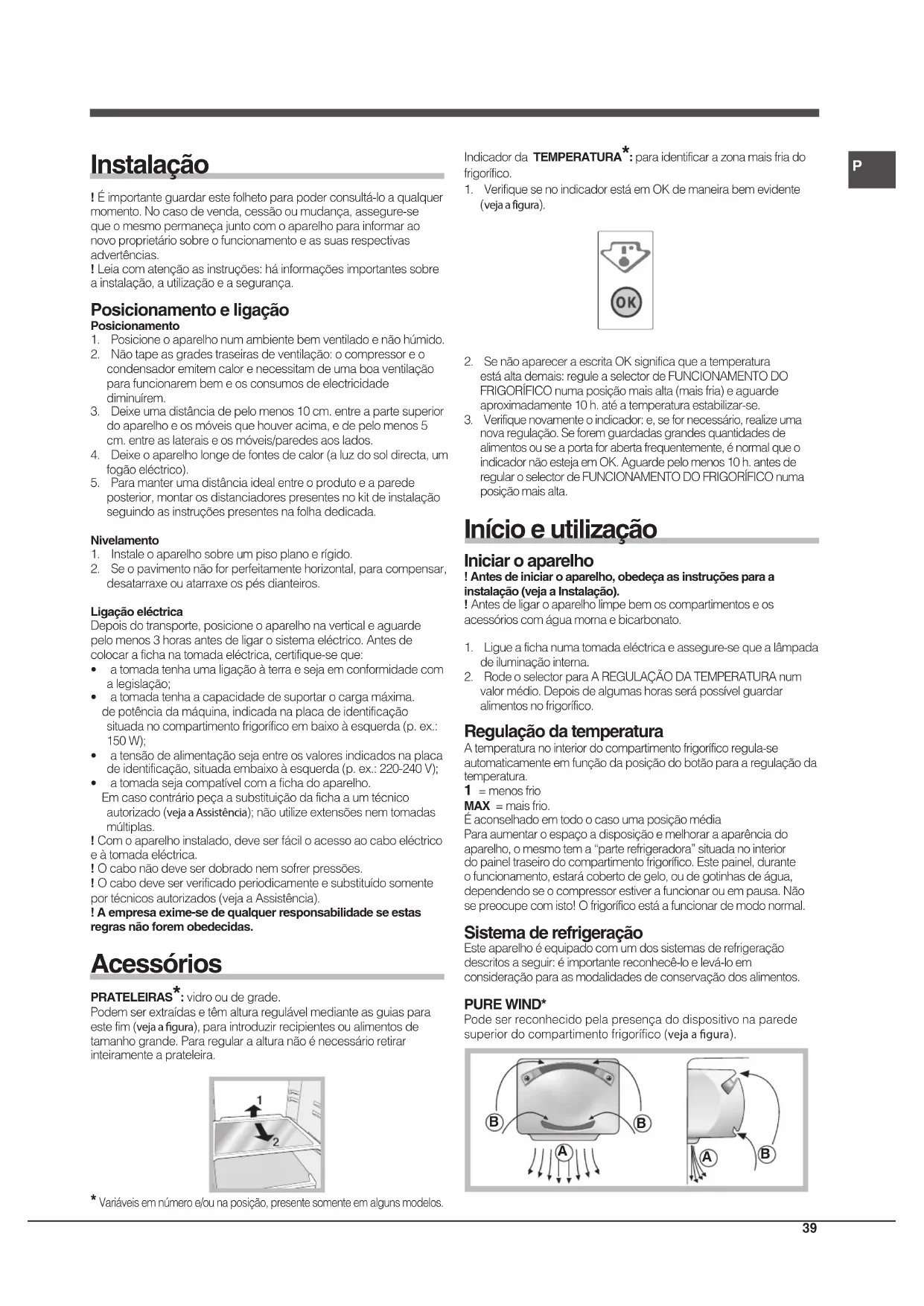 Instalação !Éimportanteguardarestefolhetoparapoderconsultá-loaqualquermomento.Nocasodevenda,cessãooumudança,assegure-sequeomesmopermaneçajuntocomoaparelhoparainformaraonovoproprietáriosobreofuncionamentoeassuasrespectivasadvertências.!Leiacomatençãoasinstruções:háinformaçõesimportantessobreainstalação,autilizaçãoeasegurança. Posicionamento e ligação Posicionamento1. Posicioneoaparelhonumambientebemventiladoenãohúmido.2. Nãotapeasgradestraseirasdeventilação:ocompressoreocondensadoremitemcalorenecessitamdeumaboaventilaçãoparafuncionarembemeosconsumosdeelectricidadediminuírem.3. Deixeumadistânciadepelomenos10cm.entreapartesuperiordoaparelhoeosmóveisquehouveracima,edepelomenos5cm.entreaslateraiseosmóveis/paredesaoslados.4. Deixeoaparelholongedefontesdecalor(aluzdosoldirecta,umfogãoeléctrico).5. Paramanterumadistânciaidealentreoprodutoeaparedeposterior,montarosdistanciadorespresentesnokitdeinstalaçãoseguindoasinstruçõespresentesnafolhadedicada.Nivelamento1. Instaleoaparelhosobreumpisoplanoerígido.2. Seopavimentonãoforperfeitamentehorizontal,paracompensar,desatarraxeouatarraxeospésdianteiros.Ligação eléctricaDepoisdotransporte,posicioneoaparelhonaverticaleaguardepelomenos3horasantesdeligarosistemaeléctrico.Antesdecolocarafichanatomadaeléctrica,certifique-seque:• atomadatenhaumaligaçãoàterraesejaemconformidadecomalegislação;• atomadatenhaacapacidadedesuportarocargamáxima. depotênciadamáquina,indicadanaplacadeidentificaçãosituadanocompartimentofrigoríficoembaixoàesquerda(p.ex.:150W);• atensãodealimentaçãosejaentreosvaloresindicadosnaplacadeidentificação,situadaembaixoàesquerda(p.ex.:220-240V);• atomadasejacompatívelcomafichadoaparelho. Emcasocontráriopeçaasubstituiçãodafichaaumtécnicoautorizado(veja a Assistência);nãoutilizeextensõesnemtomadasmúltiplas.!Comoaparelhoinstalado,deveserfáciloacessoaocaboeléctricoeàtomadaeléctrica.!Ocabonãodeveserdobradonemsofrerpressões.!Ocabodeveserverificadoperiodicamenteesubstituídosomenteportécnicosautorizados(vejaaAssistência).! A empresa exime-se de qualquer responsabilidade se estas regras não forem obedecidas. Acessórios PRATELEIRAS*:vidrooudegrade. Podemserextraídasetêmalturaregulávelmedianteasguiaspara este fim (veja a gura),paraintroduzirrecipientesoualimentosde tamanhogrande.Pararegularaalturanãoénecessárioretirarinteiramente a prateleira. IndicadordaTEMPERATURA*:paraidentificarazonamaisfriado frigorífico.1. VerifiquesenoindicadorestáemOKdemaneirabemevidente(veja a figura).2. SenãoapareceraescritaOKsignificaqueatemperaturaestáaltademais:reguleaselectordeFUNCIONAMENTODOFRIGORÍFICOnumaposiçãomaisalta(maisfria)eaguardeaproximadamente10h.atéatemperaturaestabilizar-se.3. Verifiquenovamenteoindicador:e,sefornecessário,realizeumanovaregulação.Seforemguardadasgrandesquantidadesdealimentosouseaportaforabertafrequentemente,énormalqueoindicadornãoestejaemOK.Aguardepelomenos10h.antesderegularoselectordeFUNCIONAMENTODOFRIGORÍFICOnumaposiçãomaisalta. Início e utilização Iniciar o aparelho ! Antes de iniciar o aparelho, obedeça as instruções para a instalação (veja a Instalação).!Antesdeligaroaparelholimpebemoscompartimentoseosacessórioscomáguamornaebicarbonato.1. Ligueafichanumatomadaeléctricaeassegure-sequealâmpadadeiluminaçãointerna.2. RodeoselectorparaAREGULAÇÃODATEMPERATURAnumvalormédio.Depoisdealgumashorasserápossívelguardaralimentosnofrigorífico. Regulação da temperatura Atemperaturanointeriordocompartimentofrigoríficoregula-seautomaticamenteemfunçãodaposiçãodobotãoparaaregulaçãodatemperatura. 1 = menos frio MAX = mais frio.ÉaconselhadoemtodoocasoumaposiçãomédiaParaaumentaroespaçoadisposiçãoemelhoraraaparênciadoaparelho,omesmotema“parterefrigeradora”situadanointeriordopaineltraseirodocompartimentofrigorífico.Estepainel,duranteofuncionamento,estarácobertodegelo,oudegotinhasdeágua,dependendoseocompressorestiverafuncionarouempausa.Nãosepreocupecomisto!Ofrigoríficoestáafuncionardemodonormal. Sistema de refrigeração Esteaparelhoéequipadocomumdossistemasderefrigeraçãodescritosaseguir:éimportantereconhecê-loelevá-loemconsideraçãoparaasmodalidadesdeconservaçãodosalimentos. PURE WIND* Podeserreconhecidopelapresençadodispositivonaparedesuperiordocompartimentofrigorífico(veja a gura).