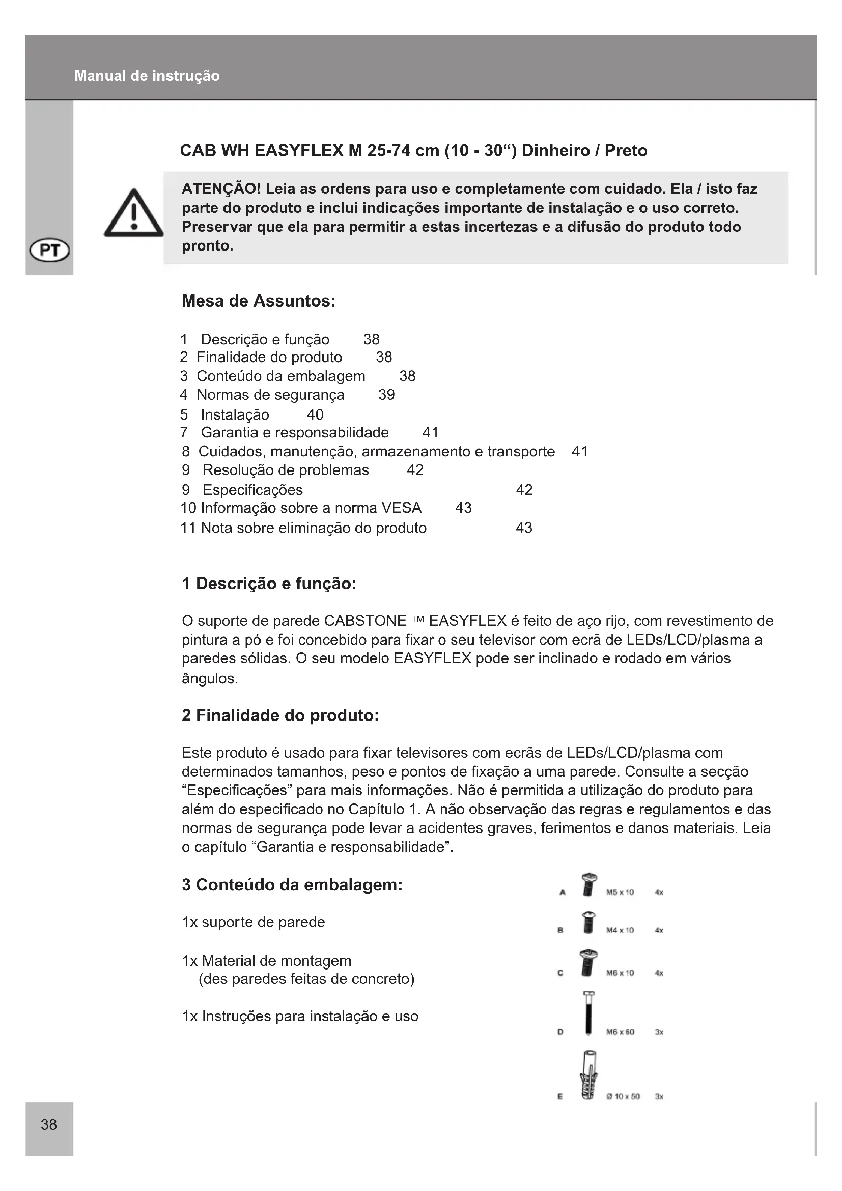 - Avfallsglas, plast, avfallsmetall, metall med mera. Denna typ av återvinning av förbrukad utrustning bidrar betydligt till skydd av naturen.37 TM38 Mesa de Assuntos: 1 Descrição e função 38 2 Finalidade do produto 38 3 Conteúdo da embalagem 38 4 Normas de segurança 39 5 Instalação 40 7 Garantia e responsabilidade 41 8 Cuidados, manutenção, armazenamento e transporte 41 9 Resolução de problemas 42 9 Especicações 42 10 Informação sobre a norma VESA 43 11 Nota sobre eliminação do produto 43 CAB WH EASYFLEX M 25-74 cm (10 - 30“) Dinheiro / Preto ATENÇÃO! Leia as ordens para uso e completamente com cuidado. Ela / isto faz parte do produto e inclui indicações importante de instalação e o uso correto. Preservar que ela para permitir a estas incertezas e a difusão do produto todo pronto. 1 Descrição e função: O suporte de parede CABSTONE