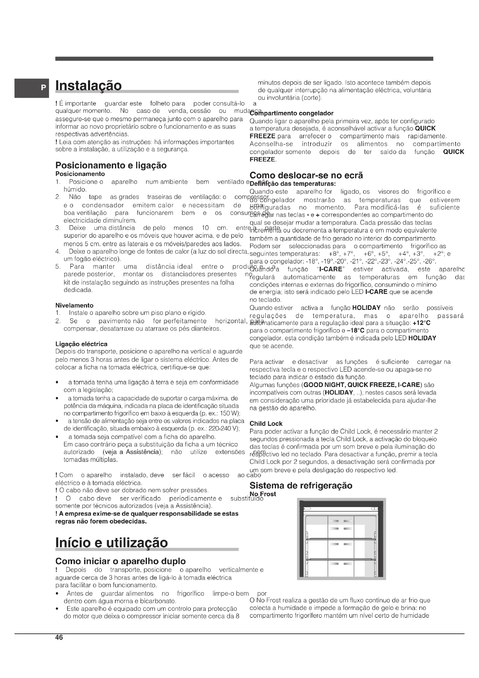 - Esteaparelhoéequipadocomumcontroloparaprotecção domotorquedeixaocompressoriniciarsomentecercada8 minutosdepoisdeserligado.Istoacontecetambémdepois dequalquerinterrupçãonaalimentaçãoeléctrica,voluntária ouinvoluntária(corte). Compartimento congelador Quandoligaroaparelhopelaprimeiravez,apósterconfigurado atemperaturadesejada,éaconselhávelactivarafunçãoQUICK FREEZEpara arrefecero compartimentomais rapidamente. Aconselha-se introduzir os alimentos no compartimento congeladorsomente depois de ter saídoda função QUICK FREEZE. Como deslocar-se no ecrã Definição das temperaturas: Quandoeste aparelhofor ligado,os visoresdo frigoríficoe docongelador mostrarão as temperaturas que estiverem configuradas no momento. Paramodificá-las é suficiente carregarnasteclas-e+correspondentesaocompartimentodo qualsedesejarmudaratemperatura.Cadapressãodasteclas incrementaoudecrementaatemperaturaeemmodoequivalente tambémaquantidadedefriogeradonointeriordocompartimento. Podemser seleccionadaspara ocompartimento frigoríficoas seguintestemperaturas: +8°,+7°, +6°,+5°, +4°,+3°, +2°;e paraocongelador:-18°,-19°,-20°,-21°,-22°,-23°,-24°,-25°,-26°. Quandoa função “I-CARE” estiver activada, este aparelho regulará automaticamente as temperaturas em função das condiçõesinternaseexternasdofrigorífico,consumindoomínimo deenergia;istoseráindicadopeloLEDI-CARE queseacende noteclado. Quandoestiver activaa funçãoHOLIDAY não serão possíveis regulações de temperatura, mas o aparelho passará automaticamenteparaaregulaçãoidealparaasituação:+12°C paraocompartimentofrigoríficoe–18°Cparaocompartimento congelador,estacondiçãotambéméindicadapeloLEDHOLIDAY queseacende. Paraactivar edesactivar asfunções ésuficiente carregarna respectivateclaeorespectivoLEDacende-seouapaga-seno tecladoparaindicaroestadodafunção. Algumasfunções(GOOD NIGHT, QUICK FREEZE, I-CARE)são incompatíveiscomoutras(HOLIDAY,..),nestescasosserálevada emconsideraçãoumaprioridadejáestabelecidaparaajudar-lhe nagestãodoaparelho. Child Lock ParapoderactivarafunçãodeChildLock,énecessáriomanter2 segundospressionadaateclaChildLock,aactivaçãodobloqueio dasteclaséconfirmadaporumsombreveepelailuminaçãodo respectivolednoteclado.Paradesactivarafunção,premiratecla ChildLockpor2segundos,adesactivaçãoseráconfirmadapor umsombreveepeladesligaçãodorespectivoled. Sistema de refrigeração No Frost ONoFrostrealizaagestãodeumfluxocontínuodearfrioque colectaahumidadeeimpedeaformaçãodegeloebrina:no compartimentofrigoríferomantémumnívelcertodehumidadeP
