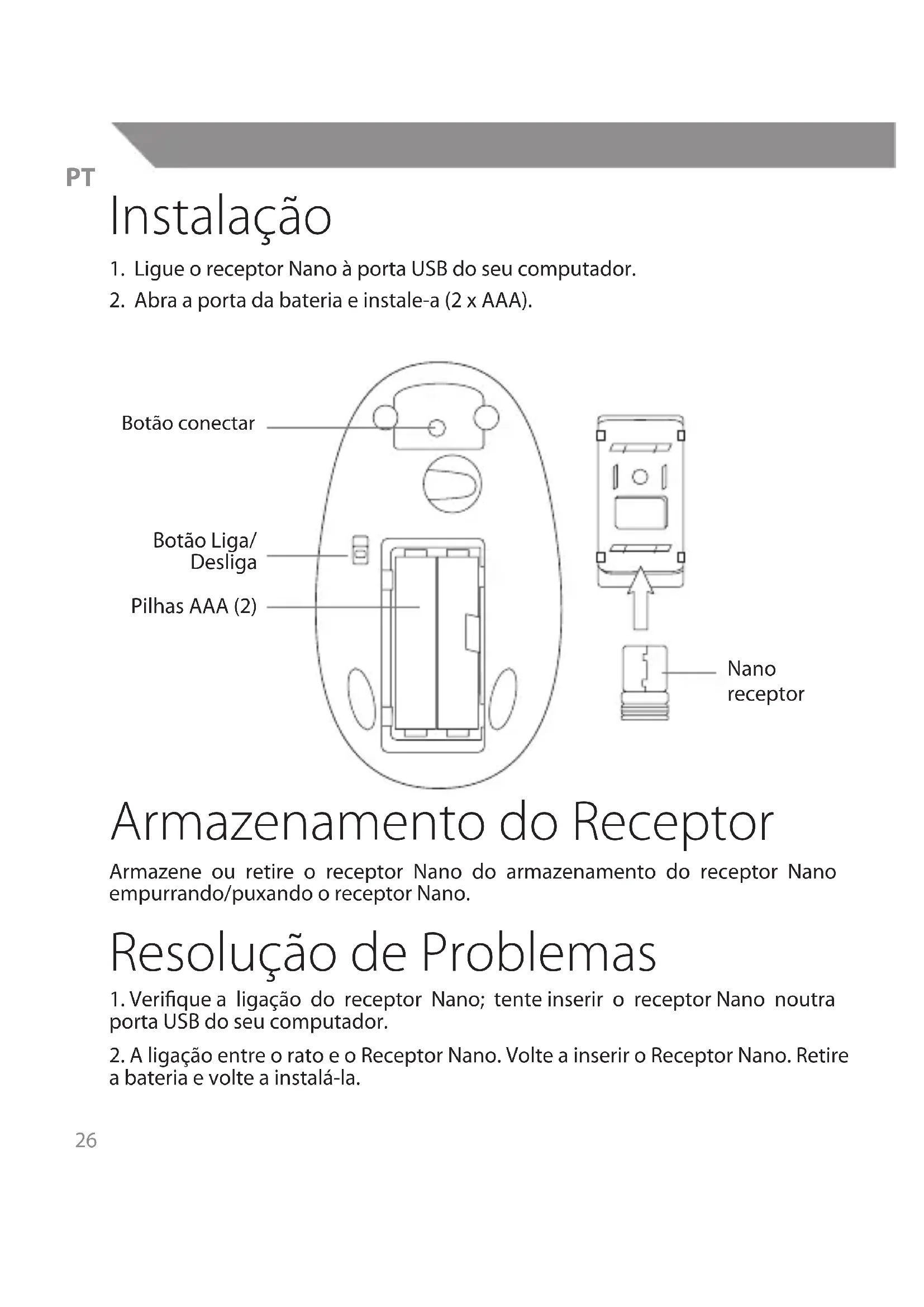 2. A ligação entre o rato e o Receptor Nano. Volte a inserir o Receptor Nano. Retire