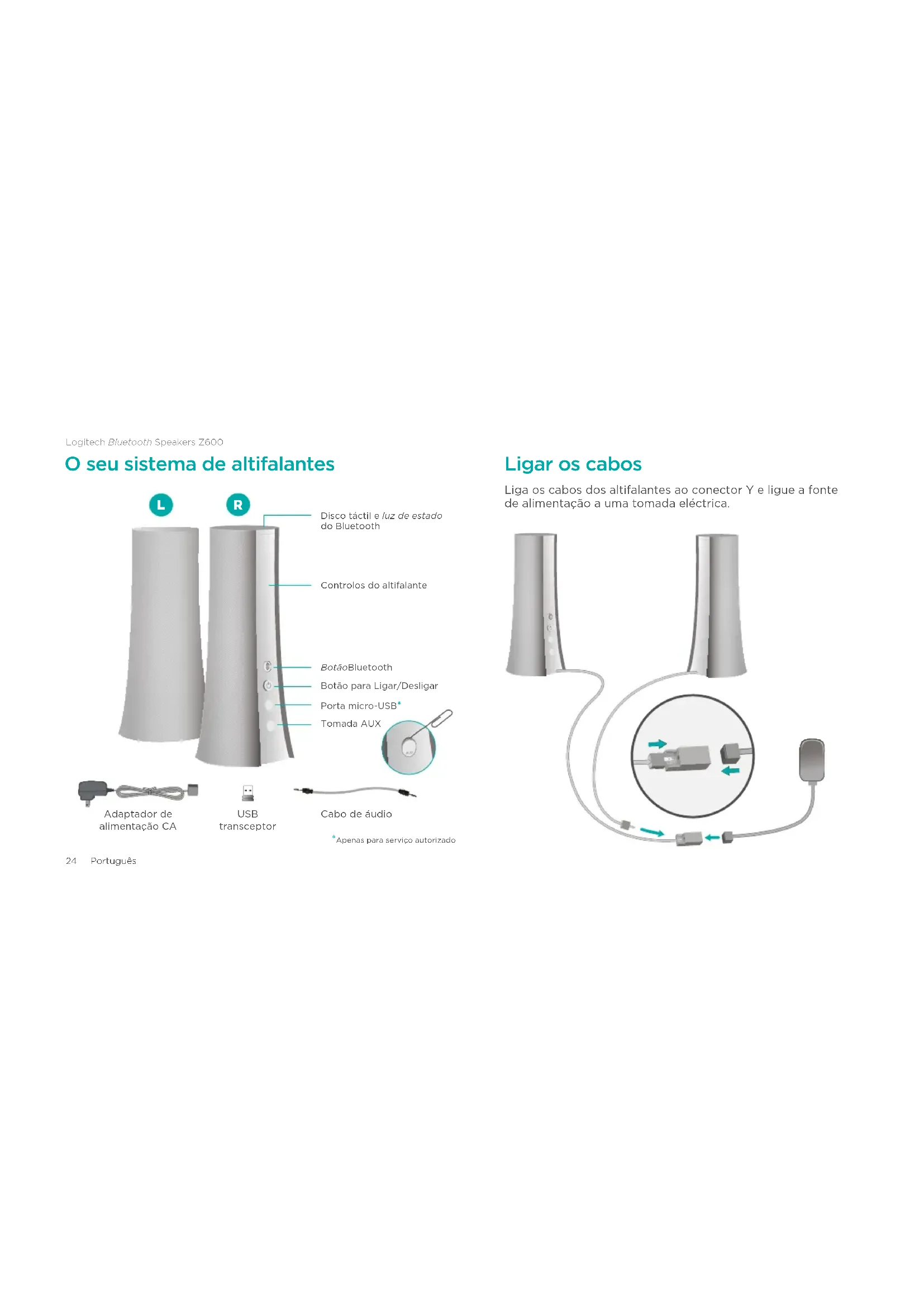Dispositivos Bluetooth Utilize a tecnologia sem fios Bluetooth para reproduzir áudio a partir de vários dispositivos ou de um dispositivo sem USB. No seu computadorAjustar volume Utilize o disco táctil na parte superior do altifalante direito para ajustar o volume. Passe o dedo no sentido dosponteiros do relógio paraaumentar o volume. Passeodedo no sentido contrário dos ponteiros do relógio para diminuir o volume. Toque uma vez para reproduzir um som que confirma que osaltifalantes estão ligados. Adicionar dispositivos Emparelhe até oito dispositivos Bluetooth com os seus altifalantes. (Podem ser ligados até três dispositivos simultaneamente.) Para cada dispositivo, repitaasinstruções na"Primeiraconfiguração". 26 Português Logitech Bluetooth Speakers Z600 Emparelhar novamente um dispositivo Bluetooth Se emparelhou um dispositivo com os altifalantes, pode estabelecer ligação novamente a esse dispositivo sempre que estiver dentro doslimites de alcance. Smartphone/tablet Toque ou clique em Logitech Z600nalista de dispositivos Bluetoothdisponíveis.Logitech Bluetooth Speakers Z600 Português 27 Configurar a saída de som num computador portátil Se estabelecer ligação a partir de um computador portátil, poderá ser necessário seleccionar novamente os altifalantes comodispositivo de saída de som. Suporte A sua opinião? Visite a Central de Produtos, o seu destino online para suporte declasse mundial. www.logitech.com/ support/z600 Encontre tutoriais, sugestões de resolução de problemas e directrizes para utilizar o LogitechZ600 com dispositivos Bluetooth. A Central de Produtos também é o local deanimados fóruns que oligam a uma comunidade activa de utilizadores conhecedores. Mac OS X Windows 7 Windows 8 Clique em opção+clique no ícone de volume nabarra do menu para apresentar as definições de entrada/saída de som. Escolha LogitechZ600 na lista Dispositivo desaída. Clique com o botão direito do rato no ícone Som na barra de tarefas eseleccione "Dispositivos de reprodução" no menu de contexto. No separador Reprodução, seleccione LogitechZ600 na lista de dispositivos e clique emSeguinte. Abra o talismã Definições e escolha Alterar definições do PC. Cliqueem Dispositivos eseleccione LogitechZ600 nalista dedispositivos. Despenda algum tempo para nos dar a sua opinião. Obrigadopor adquirir onossoproduto. www.logitech.com/ithinkBluetooth- knop BedieningsspeakerVolumeregelaar en Bluetooth-statuslampjeExtra ingangMicro-USB-poort*Aan/uit-knop Uw speakersysteem USB- transceiver Geluidsdraad Stroomadapter Sluit de speakerdraden aan op de Y-connector en steek destroomtoevoer in een stopcontact. Draden aansluiten *Alleen voor bevoegde service L R 28 NederlandsLogitech Bluetooth Speakers Z600Logitech Bluetooth Speakers Z600 Nederlands 29 Logitech Bluetooth® Speakers Z600 bieden verschillende opties voor draadloze verbindingen, om beter bij uw audioapparaten enpersoonlijke stijl te passen. Draadloze opties Eerste set-up USB-transceiver Gebruik de transceiver alsuwcomputer geen draalozeBluetooth- technologie ondersteund. Op de bedieningsspeaker Druk op de aan-uitknop. Een signaal vertelt u dat despeakers zijn ingeschakeld enklaar zijn voor gebruik. Een Bluetooth-apparaat koppelen Druk op de knop Bluetooth. Hetstatuslampje knippert snelomaan te geven dat despeakers gereed zijn om teworden gekoppeld.