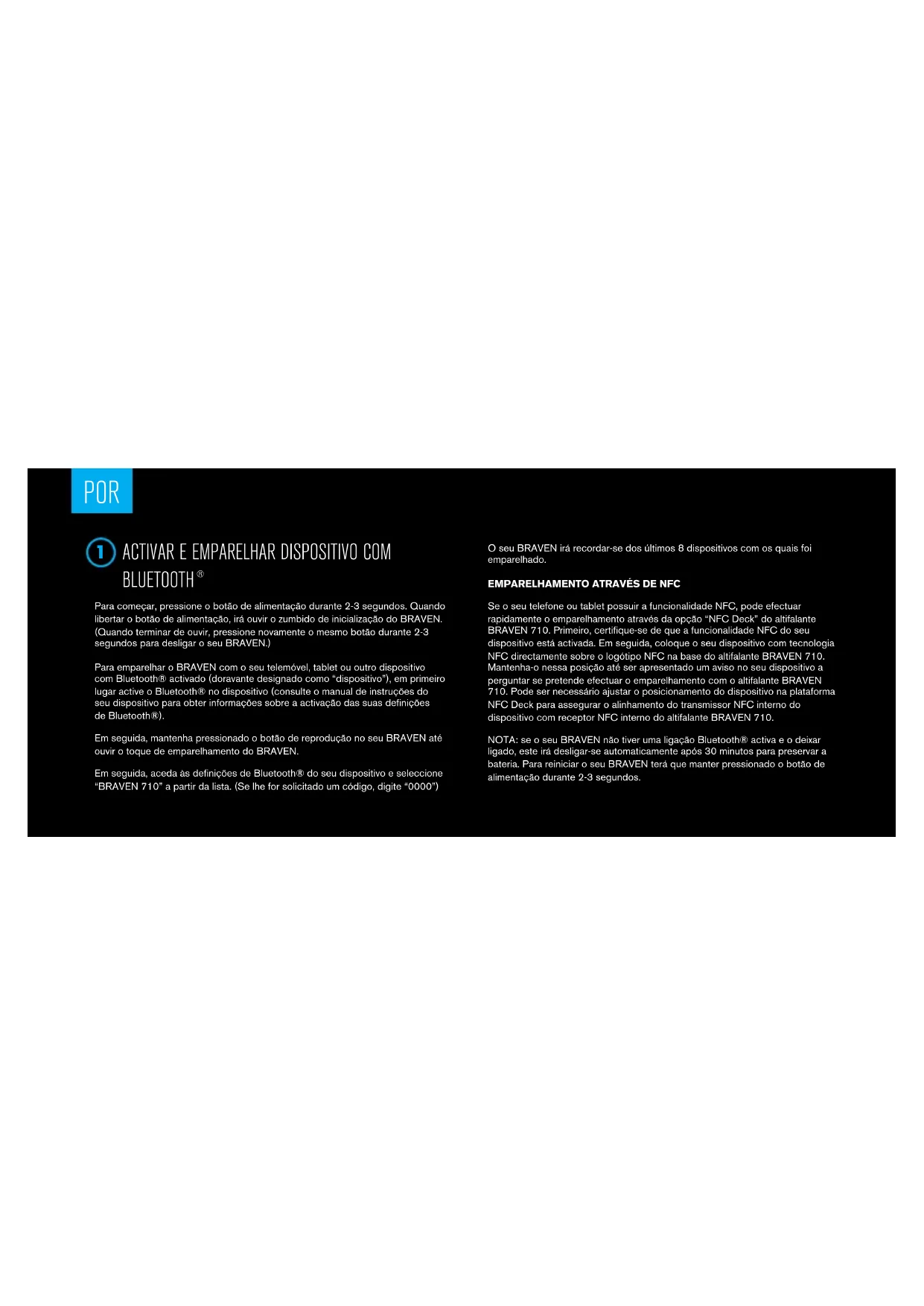NFC Deck para assegurar o alinhamento do transmissor NFC interno do dispositivo com receptor NFC interno do altifalante BRAVEN 710. NOTA: se o seu BRAVEN não tiver uma ligação Bluetooth® activa e o deixar ligado, este irá desligar-se automaticamente após 30 minutos para preservar a bateria. Para reiniciar o seu BRAVEN terá que manter pressionado o botão de alimentação durante 2-3 segundos. 1POR