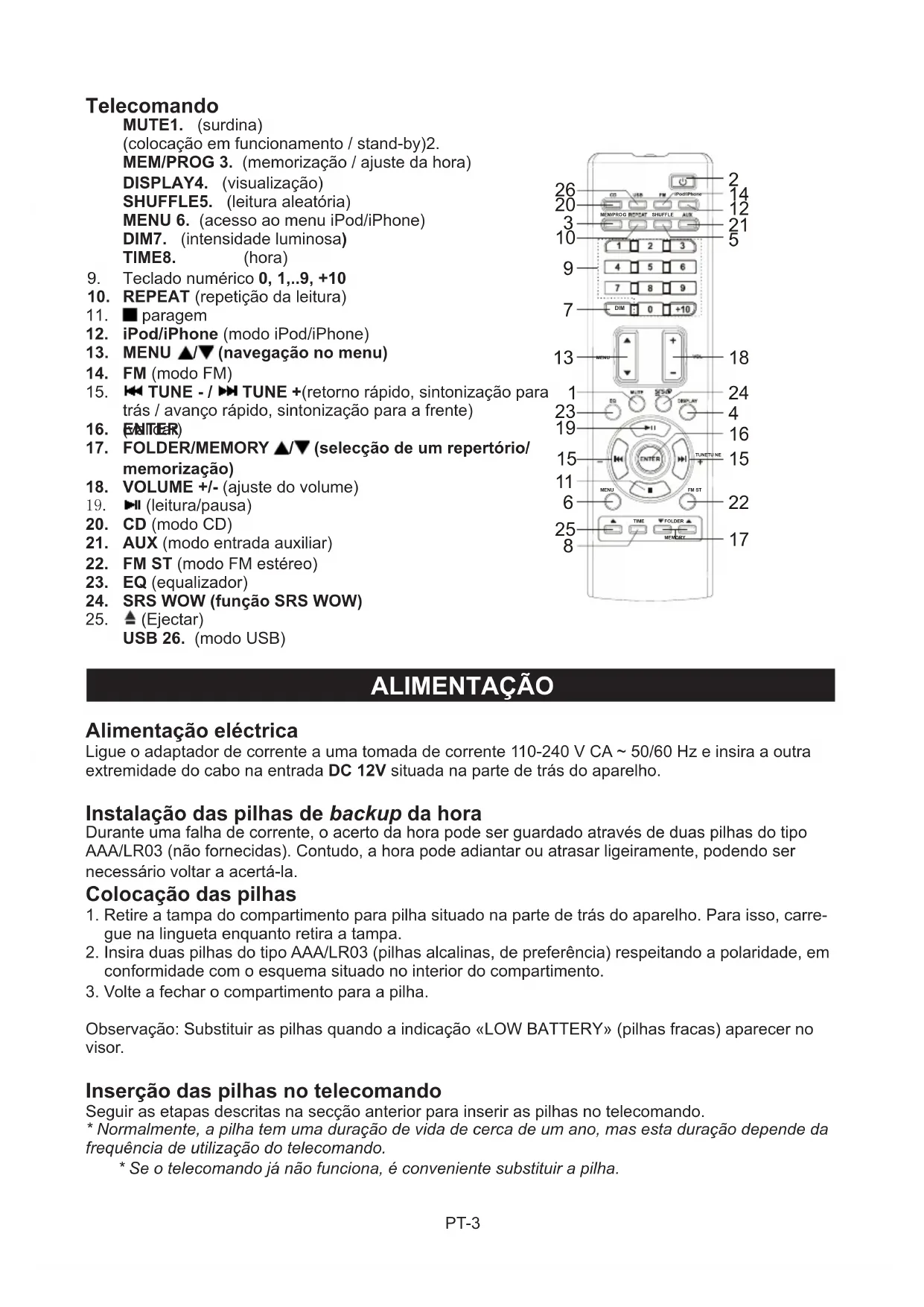 - Utilize o teclado númeroo (teclas 1...0) para seleccionar um numero de faixa. Para seleccionar um numero deinous digitos, por example «12», pressionar em «1» e(before em «2».