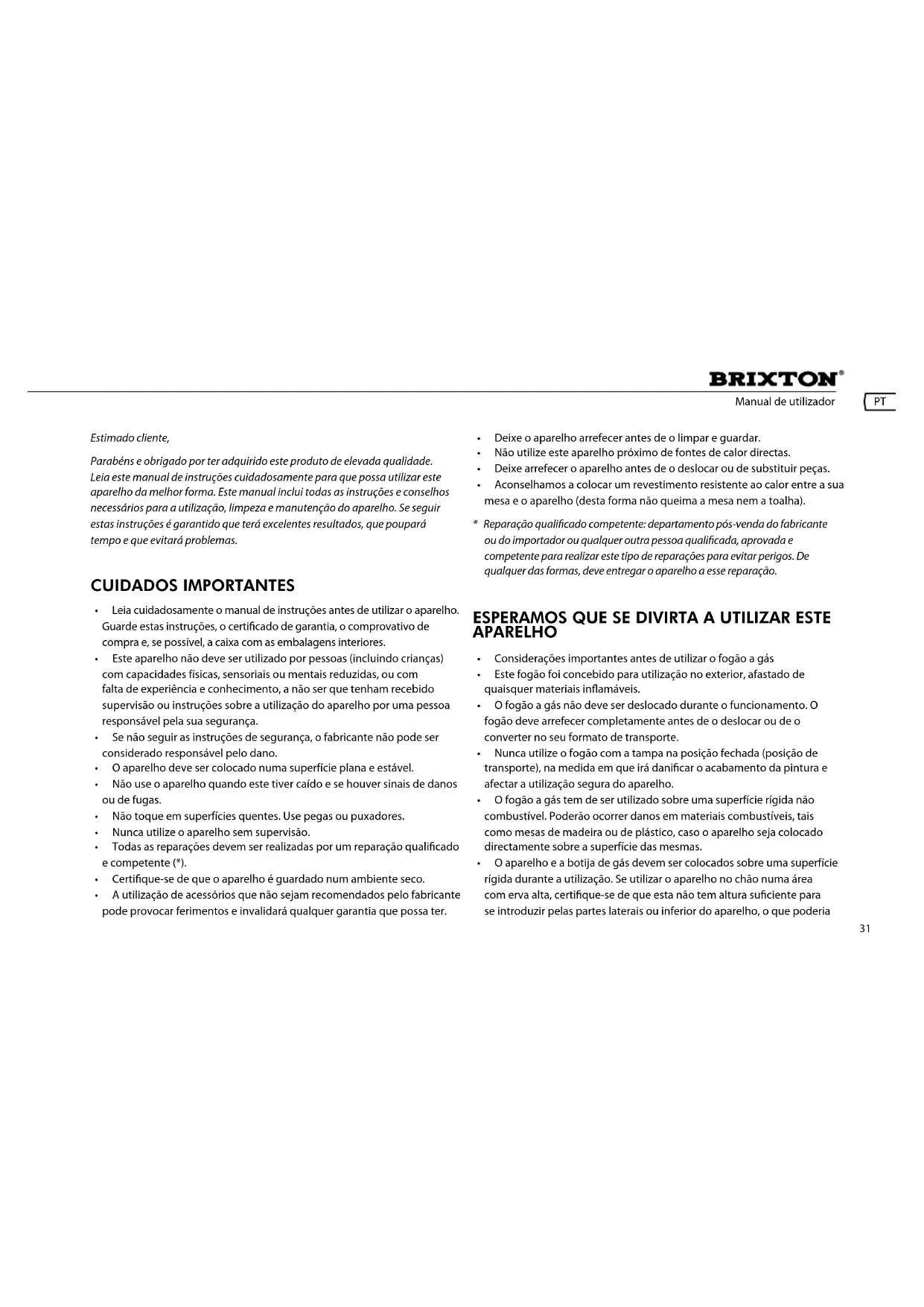 - O aparelho e a botija de gás devem ser colocados sobre uma superfície rígida durante a utilização. Se utilizar o aparelho no chão numa área com erva alta, certique-se de que esta não tem altura suciente para se introduzir pelas partes laterais ou inferior do aparelho, o que poderia Manual de utilizador PT32 fazer com que a erva pegasse fogo e originar um incêndio mais grave.