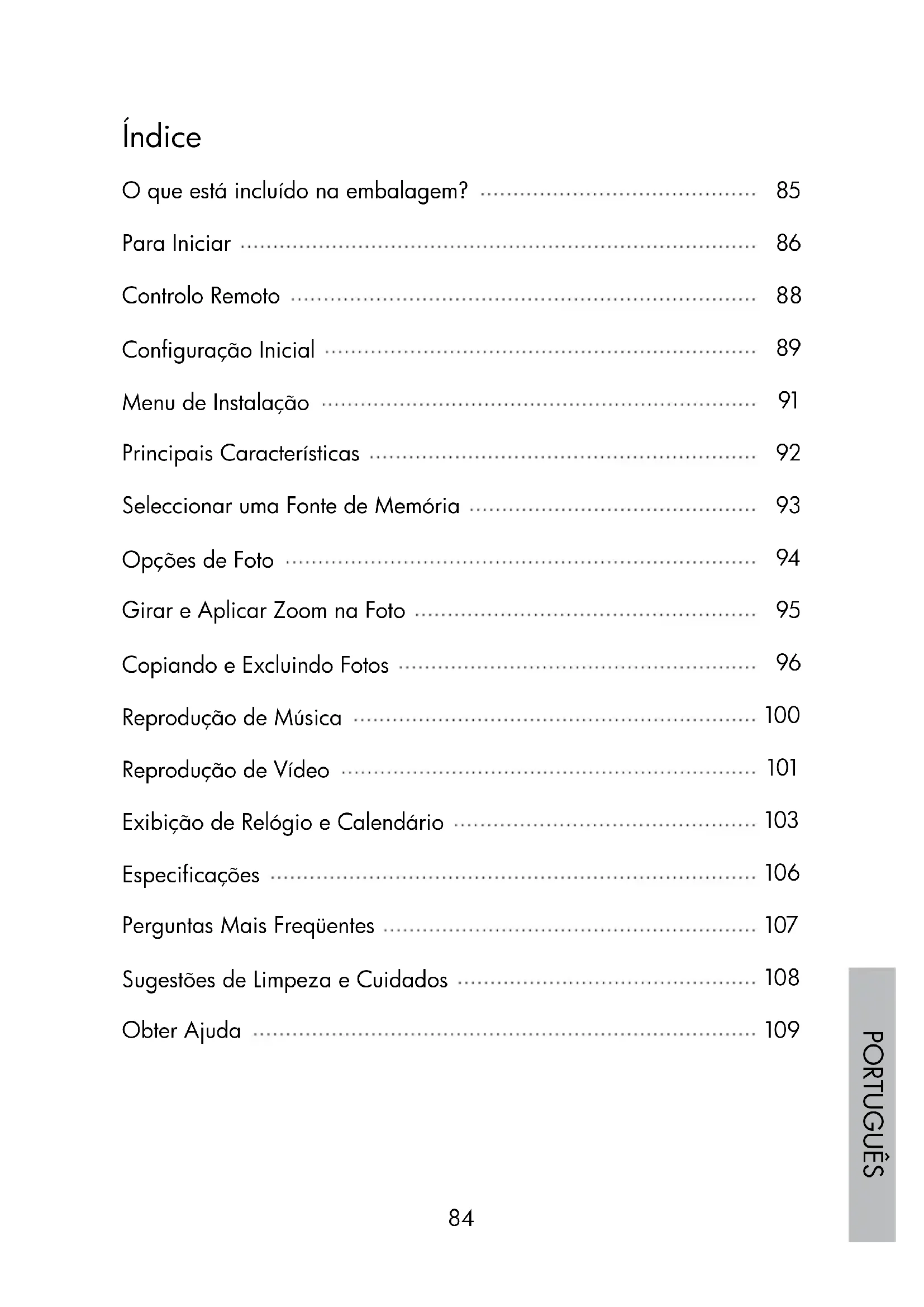 Índice O que está incluído na embalagem? Para Iniciar Controlo Remoto Configuração Inicial Menu de Instalação Principais Características Seleccionar uma Fonte de Memória Opções de Foto Girar e Aplicar Zoom na Foto Copiando e Excluindo Fotos Reprodução de Música Reprodução de Vídeo Exibição de Relógio e Calendário Especificações Perguntas Mais Freqüentes Sugestões de Limpeza e Cuidados Obter Ajuda