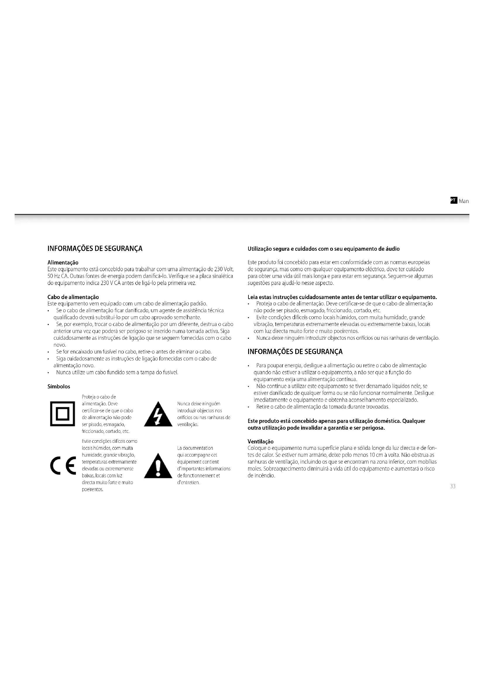- Nunca utilize um cabo fundido sem a tampa do fusível. Símbolos Proteja o cabo de alimentação. Deve certificar-se de que o cabo de alimentação não pode ser pisado, esmagado, friccionado, cortado, etc. Nunca deixe ninguém introduzir objectos nos orifícios ou nas ranhuras de ventilação. Evite condições difíceis como locais húmidos, com muita humidade, grande vibração, temperaturas extremamente elevadas ou extremamente baixas, locais com luz directa muito forte e muito poeirentos. La documentation qui accompagne cet équipement contient d'importantes informations de fonctionnement et d'entretien. Utilização segura e cuidados com o seu equipamento de áudio Este produto foi concebido para estar em conformidade com as normas europeias de segurança, mas como em qualquer equipamento eléctrico, deve ter cuidado para obter uma vida útil mais longa e para estar em segurança. Seguem-se algumas sugestões para ajudá-lo nesse aspecto. Leia estas instruções cuidadosamente antes de tentar utilizar o equipamento.