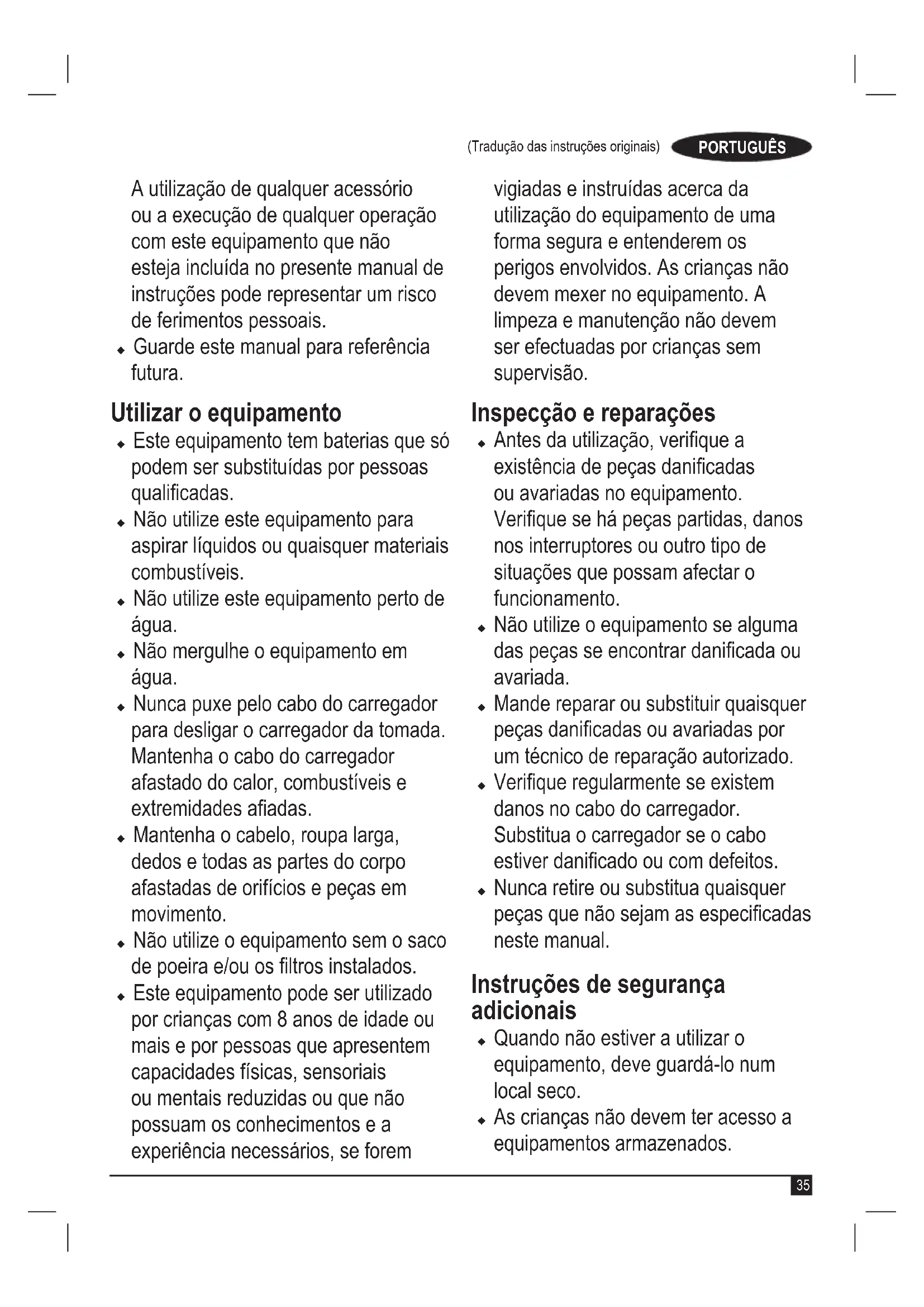 Atenção! Leia todos os avisos de segurança e todas as instruções. O não cumprimento dos seguintes avisos e instru- ções pode resultar em choque eléctrico, incêndio e/ou ferimen- tos graves. Atenção! Quando utilizar equipamentos alimentados a bateria, deve cumprir determinadas medidas de segurança, incluindo as que se seguem, de modo a reduzir os riscos de incêndio, fugas nas baterias, ferimentos e danos materiais. u Leia o ma nual com atenção e na ín tegra antes de utilizar este equipamento. u A utilização prevista para este equipamento está descrita no manual.35 (Tradução das instruções originais) PORTUGUÊS A utilização de qualquer acessório ou a execução de qualquer operação com este equipamento que não esteja incluída no presente manual de instruções pode representar um risco de ferimentos pessoais. u Guarde este manual para referência futura. Utilizar o equipamento u Este equipamento tem baterias que só podem ser substituídas por pessoas qualicadas. u Não utilize este equipamento para aspirar líquidos ou quaisquer materiais combustíveis. u Não utilize este equipamento perto de água. u Não mergulhe o equipamento em água. u Nunca puxe pelo cabo do carregador para desligar o carregador da tomada. Mantenha o cabo do carregador afastado do calor, combustíveis e extremidades aadas. u Mantenha o cabelo, roupa larga, dedos e todas as partes do corpo afastadas de orifícios e peças em movimento. u Não utilize o equipamento sem o saco de poeira e/ou os ltros instalados. u Este equipamento pode ser utilizado por crianças com 8 anos de idade ou mais e por pessoas que apresentem capacidades físicas, sensoriais ou mentais reduzidas ou que não possuam os conhecimentos e a experiência necessários, se forem vigiadas e instruídas acerca da utilização do equipamento de uma forma segura e entenderem os perigos envolvidos. As crianças não devem mexer no equipamento. A limpeza e manutenção não devem ser efectuadas por crianças sem supervisão. Inspecção e reparações u Antes da utilização, verique a existência de peças danicadas ou avariadas no equipamento. Verique se há peças partidas, danos nos interruptores ou outro tipo de situações que possam afectar o funcionamento. u Não utilize o equipamento se alguma das peças se encontrar danicada ou avariada. u Mande reparar ou substituir quaisquer peças danicadas ou avariadas por um técnico de reparação autorizado. u Verique regularmente se existem danos no cabo do carregador. Substitua o carregador se o cabo estiver danicado ou com defeitos. u Nunca retire ou substitua quaisquer peças que não sejam as especicadas neste manual. Instruções de segurança adicionais u Quando não estiver a utilizar o equipamento, deve guardá-lo num local seco. u As crianças não devem ter acesso a equipamentos armazenados.36 (Tradução das instruções originais) PORTUGUÊS Riscos residuais Podem surgir riscos residuais adicionais durante a utilização da ferramenta, que podem não constar nos avisos de segurança incluídos. Estes riscos podem resultar de má utilização, uso prolongado, etc. Mesmo com o cumprimento dos regulamentos de segurança relevantes e a implementação de dispositivos de segurança, alguns riscos residuais podem não ser evitados. Estes incluem: u Ferimentos causados pelo contacto com peças em movimento. u Ferimentos causados pelo contacto com peças quentes. u Ferimentos causados durante a troca de peças ou acessórios. u Ferimentos causados pela utilização prolongada do equipamento. Quando utilizar um equipamento durante um período prolongado, faça pausas regulares. u Problemas de saúde causados pela inalação de poeiras resultantes da utilização da ferramenta (exemplo: trabalhos em madeira, especialmente carvalho, faia e MDF). Baterias e carregadores Baterias u Nunca abra a bateria, seja qual for o motivo. u Não exponha a bateria à água. u Não exponha a bateria ao calor. u Não armazene em locais onde a temperatura possa exceder os 40 °C. u Carregue apenas a temperaturas ambiente entre 10 °C e 40 °C. u Carregue apenas com o carregador fornecido com o equipamento/ ferramenta. A utilização do carregador errado pode resultar em choque eléctrico ou sobreaquecimento da bateria. u Ao eliminar as baterias, siga as instruções indicadas na secção “Proteção do ambiente”. u Não danique a bateria por perfuração ou impacto, pois poderá originar risco de ferimentos e incêndio. u Não carregue baterias danicadas. u Em condições extremas, pode ocorrer uma fuga nas baterias. Se detectar fuga de electrólito das baterias, limpe o líquido cuidadosamente com um pano. Evite o contacto com a pele. u Em caso de contacto com a pele ou com os olhos, siga as instruções seguintes. Atenção! O electrólito da bateria pode causar ferimentos ou danos materiais. Em caso de contacto com a pele, enxagúe imediatamente com água. Em caso de vermelhidão, dor ou irritação, contacte um médico. Em caso de contacto com os olhos, enxagúe imediatamente com água limpa e procure ajuda médica. Carregadores O carregador foi concebido para uma tensão especíca.37 (Tradução das instruções originais) PORTUGUÊS Verique sempre se a tensão de alimentação corresponde à tensão indicada na placa de especicações e as informações indicadas na tabela de dados técnicos. Atenção! Nunca substitua a unidade do carregador por uma tomada de alimentação normal. u Utilize o carregador da BLACK+DECKER apenas para carregar a bateria do equipamento/ ferramenta com o qual foi fornecido. Outras baterias podem rebentar, provocando ferimentos e danos. u Nunca carregue baterias não recarregáveis. u Se o cabo de alimentação estiver danicado, tem de ser substituído pelo fabricante ou por um centro de assistência autorizado da BLACK+DECKER para evitar acidentes. u Não exponha o carregador à água.u Não abra o carregador.u Não manipule o interior do carregador.u 