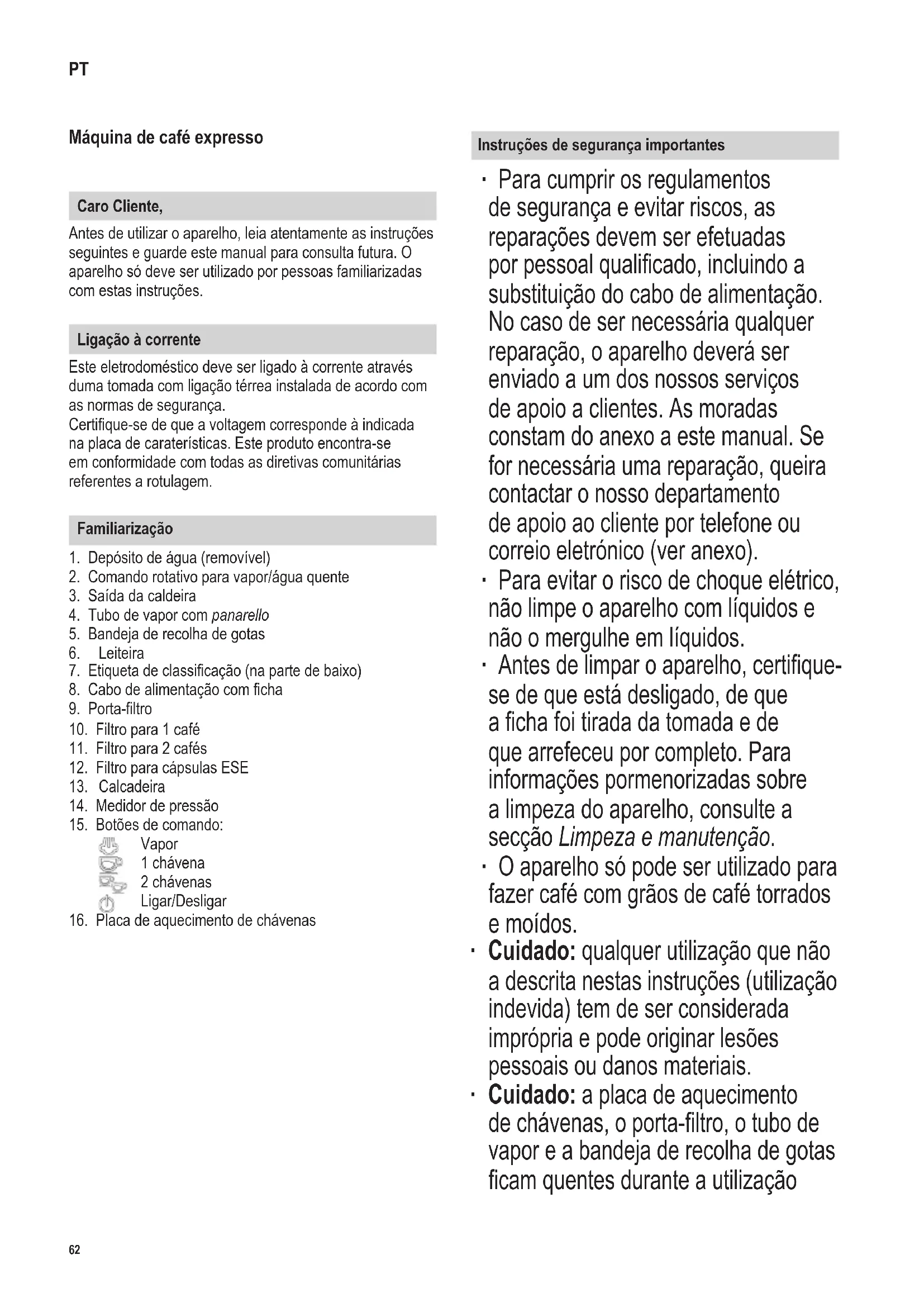 Instruções de segurança importantes ∙ Para cumprir os regulamentos de segurança e evitar riscos, as reparações devem ser efetuadas por pessoal qualicado, incluindo a substituição do cabo de alimentação. No caso de ser necessária qualquer reparação, o aparelho deverá ser enviado a um dos nossos serviços de apoio a clientes. As moradas constam do anexo a este manual. Se for necessária uma reparação, queira contactar o nosso departamento de apoio ao cliente por telefone ou correio eletrónico (ver anexo). ∙ Para evitar o risco de choque elétrico, não limpe o aparelho com líquidos e não o mergulhe em líquidos. ∙ Antes de limpar o aparelho, certique- se de que está desligado, de que a cha foi tirada da tomada e de que arrefeceu por completo. Para informações pormenorizadas sobre a limpeza do aparelho, consulte a secção Limpeza e manutenção. ∙ O aparelho só pode ser utilizado para fazer café com grãos de café torrados e moídos. ∙ Cuidado: qualquer utilização que não a descrita nestas instruções (utilização indevida) tem de ser considerada imprópria e pode originar lesões pessoais ou danos materiais. ∙ Cuidado: a placa de aquecimento de chávenas, o porta-ltro, o tubo de vapor e a bandeja de recolha de gotas cam quentes durante a utilização PT63 142 x 208 mm e permanecerão quentes por algum tempo - risco sério de queimaduras. ∙ Cuidado: mantenha sempre as mãos bem afastadas das aberturas de saída (saída da caldeira, porta-ltro, panarello) durante o funcionamento - perigo de escaldadura. ∙ Este aparelho pode ser utilizado por crianças (com pelo menos 8 anos de idade) e por pessoas com capacidades físicas, sensoriais ou mentais reduzidas ou que careçam de experiência e conhecimento, desde que sejam supervisionadas ou recebam instruções sobre a utilização do aparelho e compreendam plenamente todos os perigos e precauções de segurança envolvidos. ∙ As crianças devem ser vigiadas para assegurar que não brinquem com o aparelho. ∙ Não deve permitir que as tarefas de limpeza e manutenção sejam efetuadas por crianças, a menos que estas sejam supervisionadas e tenham pelo menos 8 anos de idade. ∙ O aparelho e o seu cabo de alimentação elétrica devem estar sempre fora do alcance das crianças com menos de 8 anos de idade. ∙ O aparelho não pode ser utilizado no interior de um armário fechado. ∙ Este aparelho destina-se a aplicações domésticas ou semelhantes, como em: - cozinhas para funcionários em lojas, escritórios e ambientes de trabalho semelhantes; - ambientes de trabalho agrícola; - utilização por clientes em hotéis, motéis e alojamentos similares; - ambientes do tipo “alojamento e pequeno-almoço”. ∙ Sempre que utilizar o aparelho, examine meticulosamente o corpo principal, incluindo o cabo de alimentação elétrica e qualquer acessório aplicado, em busca de possíveis falhas. Se, por exemplo, o aparelho tiver caído sobre uma superfície dura ou o seu cabo de alimentação elétrica tiver sido puxado com força excessiva, não deve continuar a utilizá-lo: até mesmo os danos invisíveis podem ter efeitos adversos sobre a segurança de funcionamento do aparelho. ∙ Não abra o panarello a menos que tenha colocado um recipiente adequado debaixo. Cuidado: existe perigo de escaldadura devido ao vapor quente emitido. ∙ Cuidado: só deve colocar chávenas na placa de aquecimento de chávenas. ∙ Antes de ligar a máquina de café expresso, certique-se de que esteja abastecida de água. ∙ Não ultrapasse a marca MAX no depósito de água. ∙ Use somente água da torneira fresca e limpa. ∙ Durante a utilização, o aparelho deve ser colocado numa superfície nivelada, antideslizante e impermeável a salpicos e manchas. ∙ Não utilize o aparelho debaixo de louceiros de parede ou objetos semelhantes; há o risco de o vapor car retido debaixo. ∙ Mantenha o cabo elétrico longe de qualquer parte aquecida do aparelho. ∙ Não deixe a cafeteira a funcionar sem atendimento. Mantenha o aparelho longe de superfícies quentes, chamas ou vapores inamáveis. ∙ Cuidado: mantenha quaisquer materiais de embalagem bem afastados das crianças; existe risco de asxia. ∙ Retire sempre a cha da tomada - no caso de mau funcionamento, - antes de limpar o aparelho, - no nal de cada utilização. ∙ Ao retirar a cha da tomada nunca puxe pelo cabo elétrico. ∙ Não toque na cha com as mãos molhadas. ∙ Não deixe o cabo elétrico pendurado. ∙ Utilize apenas peças acessórias originais; a utilização de quaisquer acessórios que não os fornecidos pelo fabricante pode originar perigos sérios para o utilizador. ∙ Declinamos qualquer responsabilidade se a avaria resultar de uso indevido, ou se não forem respeitadas as instruções.64 142 x 208 mm Antes da primeira utilização ∙ Desembale completamente o aparelho e retire todos os materiais de embalagem. Porém, não remova o autocolante de segurança. ∙ Limpe todas as peças destacáveis conforme descrito na secção Limpeza e manutenção. ∙ Ajuste o panarello ao tubo de vapor. ∙ Encha o depósito com água (consulte Preparação de expresso). ∙ Ajuste a dureza da água conforme descrito em Conguração da dureza da água. ∙ Antes de fazer expresso pela primeira vez, enxague o sistema extraindo 2 ou 3 chávenas grandes de água, conforme descrito em Preparação de expresso, mas sem usar café. ∙ Durante este processo, utilize repetidamente o panarello conforme descrito em Emissão de água quente. ∙ Deve efetuar o mesmo procedimento se o aparelho tiver estado sem utilização por um período prolongado. ∙ Antes de ligar o aparelho, certique-se de que o comando rotativo esteja na posição . Caso contrário, todos os botões de funções piscarão e o aparelho não poderá ser utili-zado. Preparação de bebidas Medidor de pressão O medidor de pressão integrado mostra a pressão da infusão durante a preparação do 