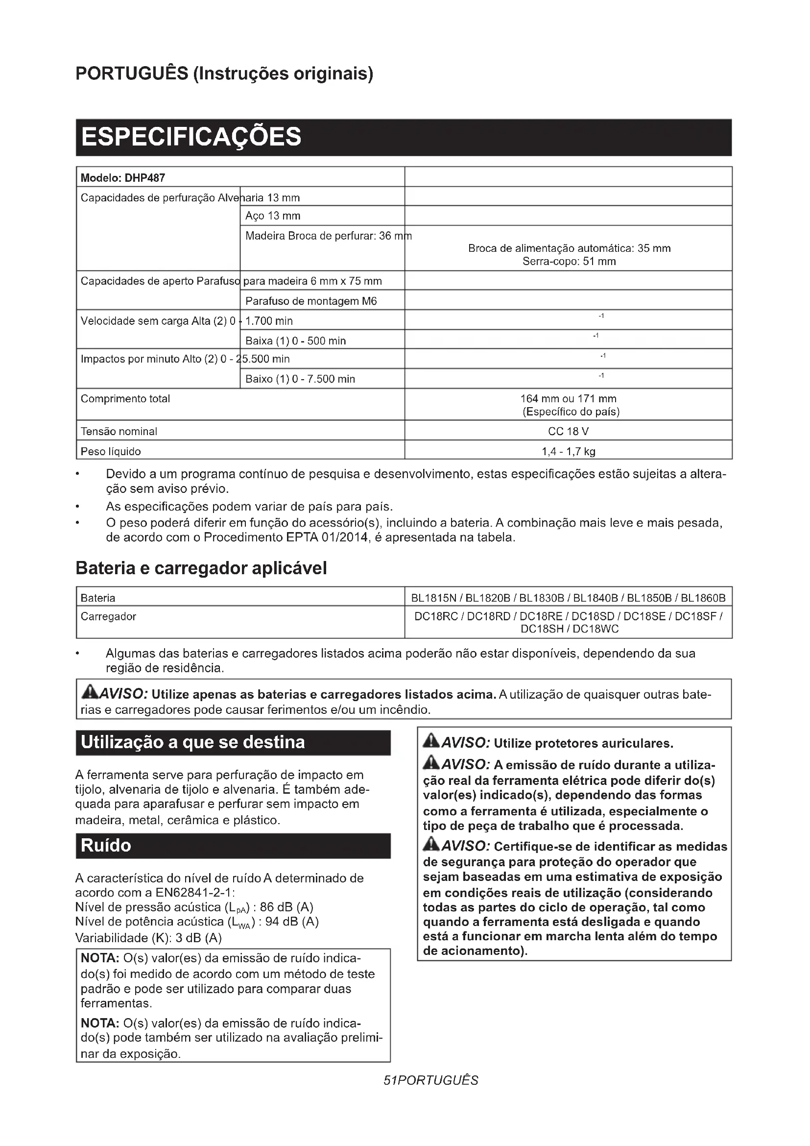 - O peso poderá diferir em função do acessório(s), incluindo a bateria. A combinação mais leve e mais pesada, de acordo com o Procedimento EPTA 01/2014, é apresentada na tabela. Bateria e carregador aplicável Bateria BL1815N / BL1820B / BL1830B / BL1840B / BL1850B / BL1860B Carregador DC18RC / DC18RD / DC18RE / DC18SD / DC18SE / DC18SF / DC18SH / DC18WC