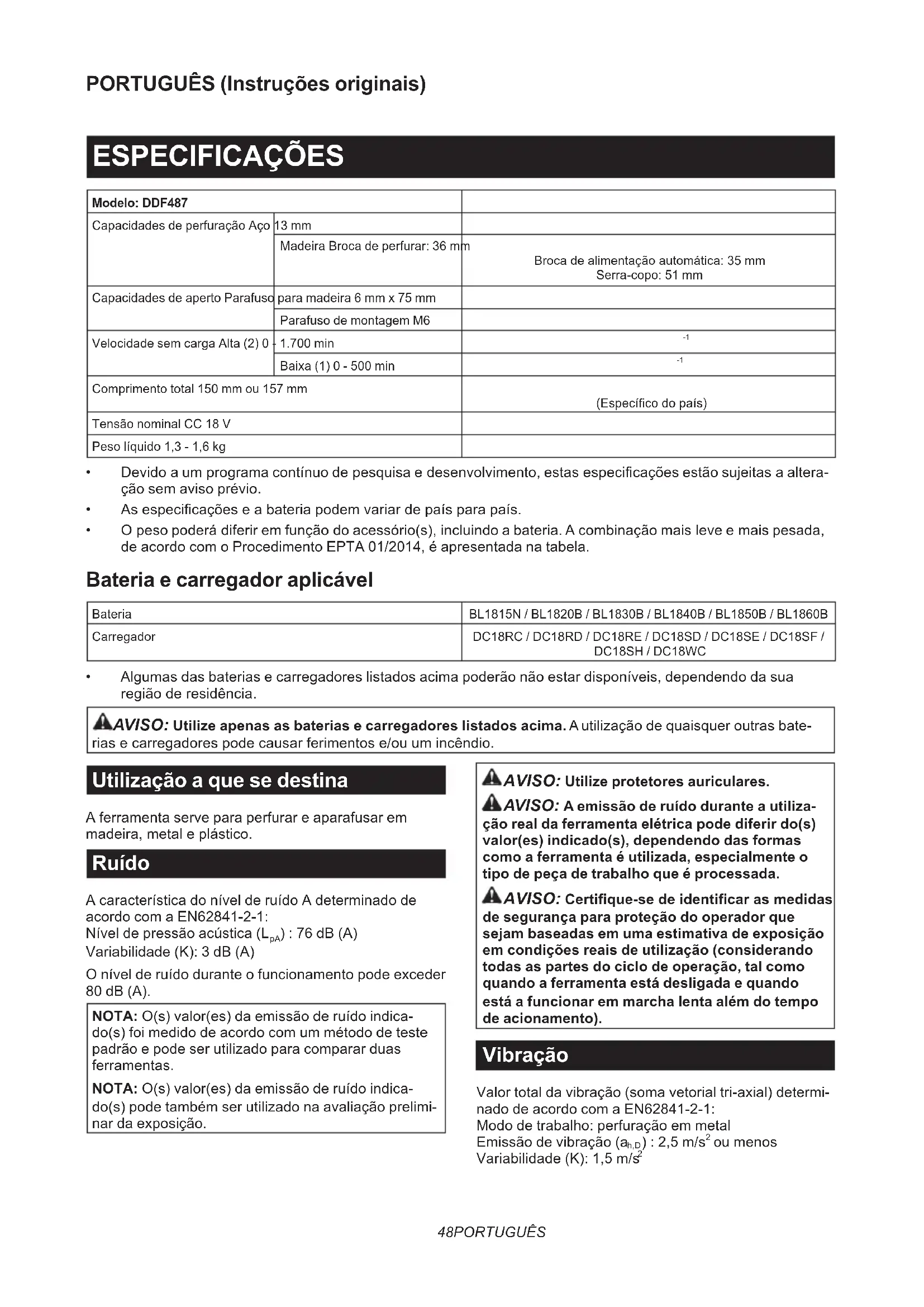 - O peso poderá diferir em função do acessório(s), incluindo a bateria. A combinação mais leve e mais pesada, de acordo com o Procedimento EPTA 01/2014, é apresentada na tabela. Bateria e carregador aplicável Bateria BL1815N / BL1820B / BL1830B / BL1840B / BL1850B / BL1860B Carregador DC18RC / DC18RD / DC18RE / DC18SD / DC18SE / DC18SF / DC18SH / DC18WC