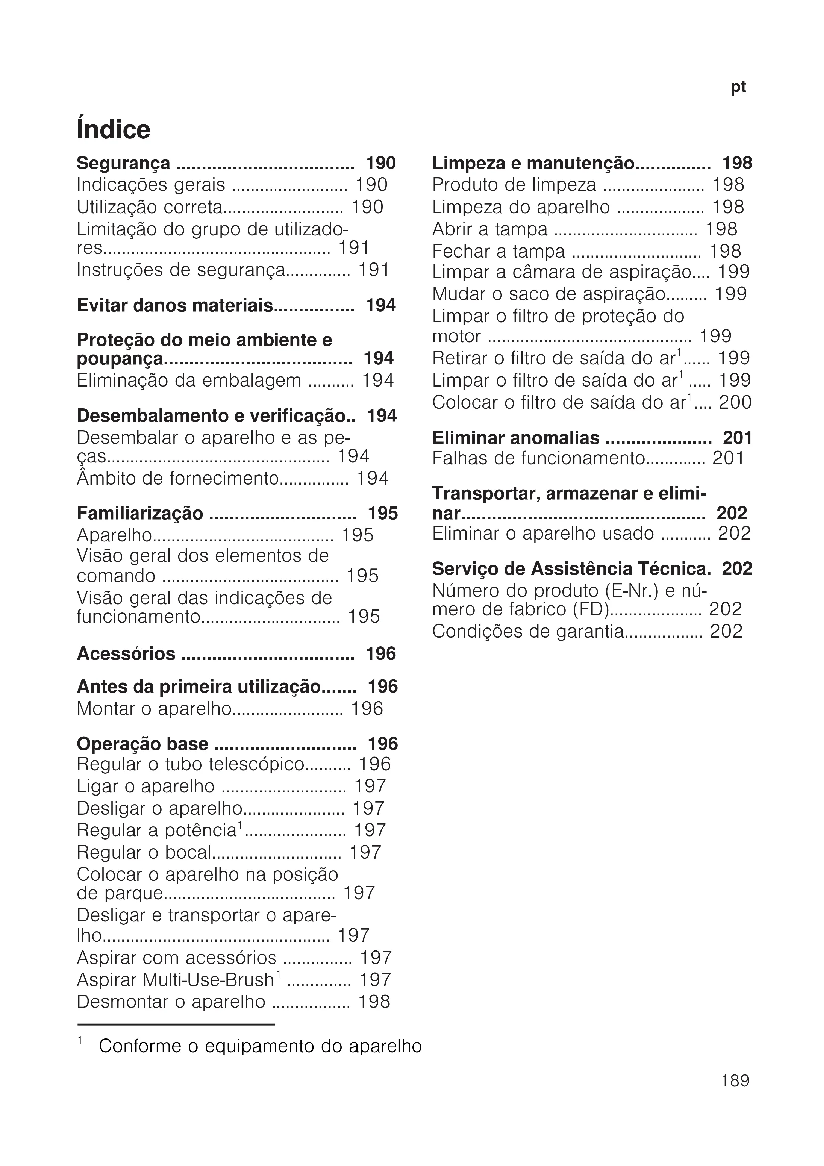Segurança Respeite as seguintes indicações de segurança. Indicações gerais ¡ Leia atentamente este manual. ¡ Guarde estas instruções e as informações sobre o produto pa- ra posterior utilização ou para entregar a futuros proprietários. ¡ Se detetar danos de transporte, não ligue o aparelho. Utilização correta Para um uso seguro e correto do aparelho, respeite as indica- ções relativas à utilização correta. O aparelho apenas pode ser utilizado: ¡ com peças e acessórios originais. A garantia cessa em caso de danos provocados pela utilização de produtos de terceiros. ¡ para limpar superfícies. ¡ para uso doméstico e em espaços fechados domésticos à tem- peratura ambiente. ¡ a uma altitude de, no máximo, 2000m acima do nível do mar. Não utilize o aparelho: ¡ para limpar pessoas ou animais. ¡ para aspirar substâncias nocivas para a saúde, com arestas vi- vas, quentes ou incandescentes. ¡ para aspirar substâncias húmidas ou líquidas. ¡ para aspirar substâncias e gases facilmente inflamáveis ou ex- plosivos. ¡ para aspirar cinza, fuligem de recuperadores de calor e siste- mas de aquecimento central. ¡ para aspirar pó de toner de impressão e cópia. ¡ para aspirar entulho. Desligue o aparelho da corrente quando: ¡ limpar o aparelho.Segurança pt