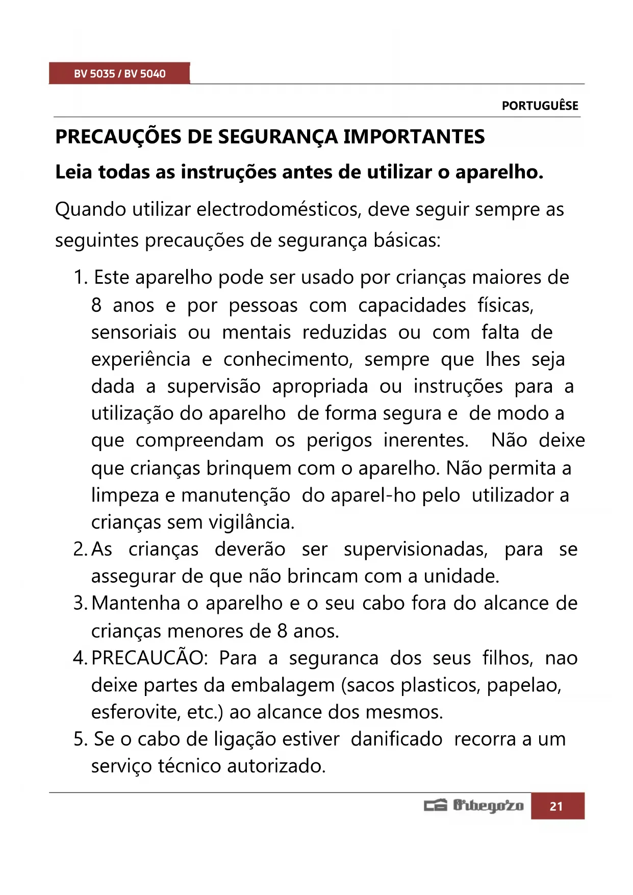 Encontre gratuitamente o manual do aparelho BV 5035 Orbegozo em formato PDF.