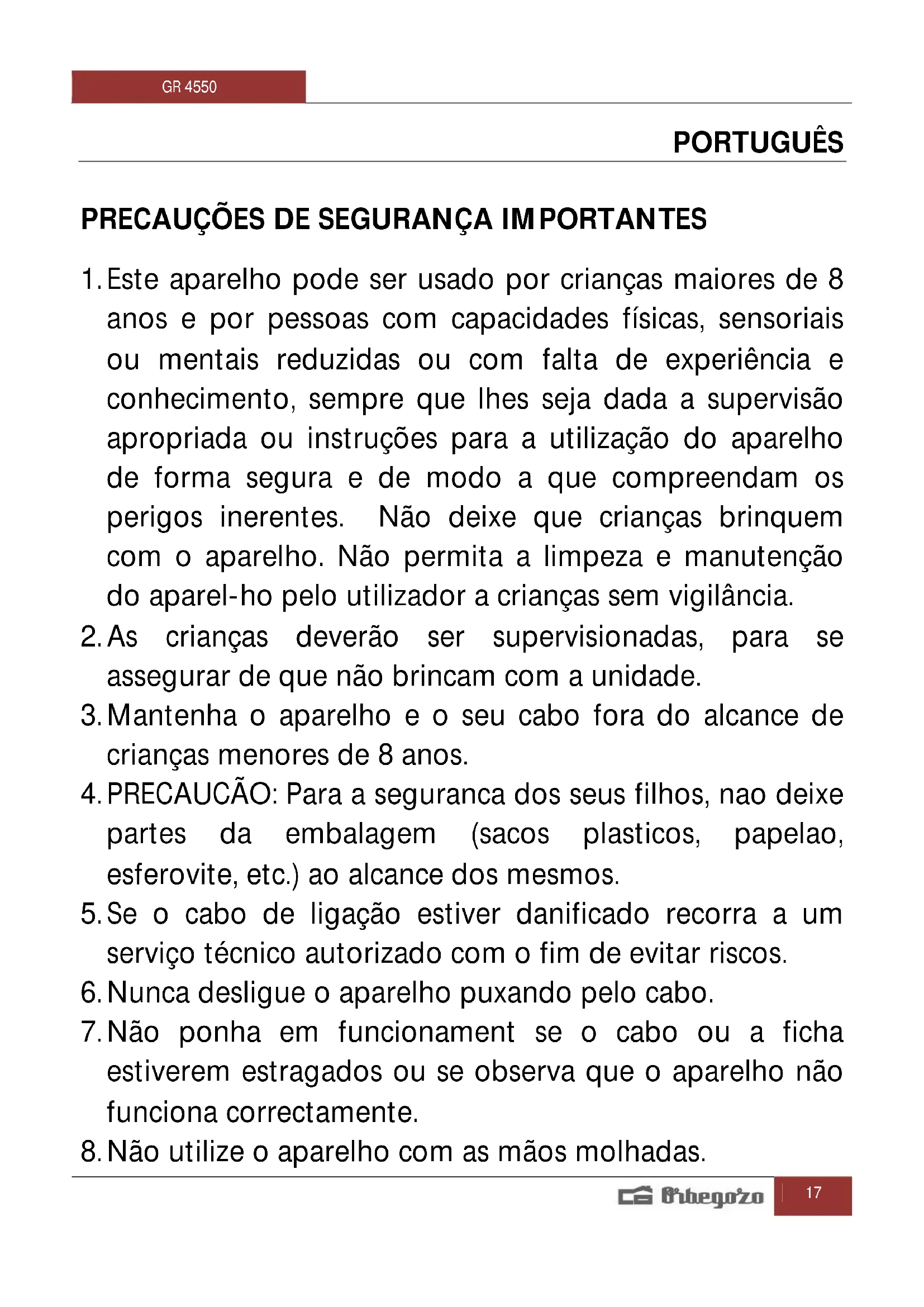 Encontre gratuitamente o manual do aparelho GR 4550 Orbegozo em formato PDF.