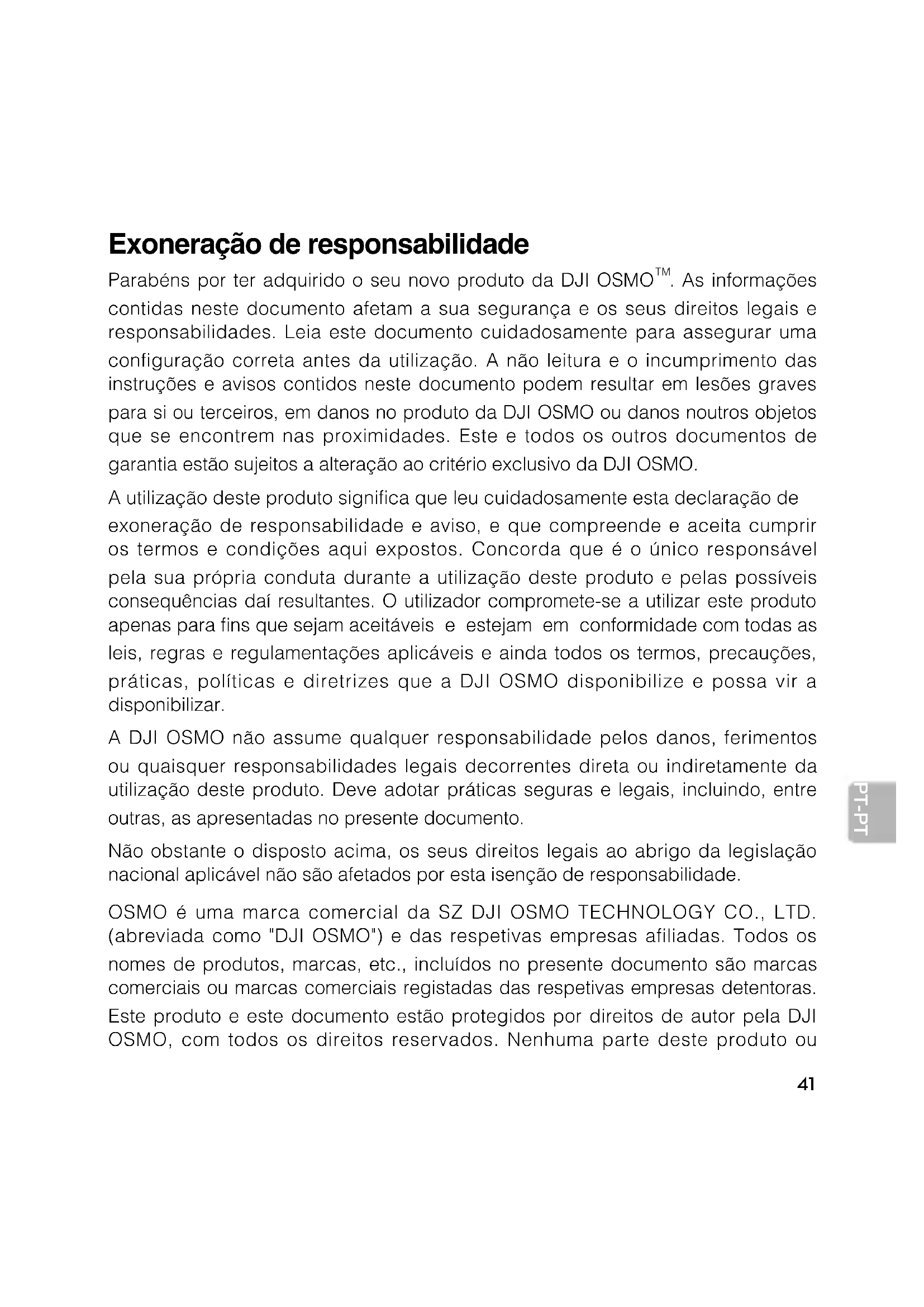 . As informações contidas neste documento afetam a sua segurança e os seus direitos legais e responsabilidades. Leia este documento cuidadosamente para assegurar uma configuração correta antes da utilização. A não leitura e o incumprimento das instruções e avisos contidos neste documento podem resultar em lesões graves para si ou terceiros, em danos no produto da DJI OSMO ou danos noutros objetos que se encontrem nas proximidades. Este e todos os outros documentos de garantia estão sujeitos a alteração ao critério exclusivo da DJI OSMO. A utilização deste produto signica que leu cuidadosamente esta declaração de exoneração de responsabilidade e aviso, e que compreende e aceita cumprir os termos e condições aqui expostos. Concorda que é o único responsável pela sua própria conduta durante a utilização deste produto e pelas possíveis consequências daí resultantes. O utilizador compromete-se a utilizar este produto apenas para ns que sejam aceitáveis e estejam em conformidade com todas as leis, regras e regulamentações aplicáveis e ainda todos os termos, precauções, práticas, políticas e diretrizes que a DJI OSMO disponibilize e possa vir a disponibilizar. A DJI OSMO não assume qualquer responsabilidade pelos danos, ferimentos ou quaisquer responsabilidades legais decorrentes direta ou indiretamente da utilização deste produto. Deve adotar práticas seguras e legais, incluindo, entre outras, as apresentadas no presente documento. Não obstante o disposto acima, os seus direitos legais ao abrigo da legislação nacional aplicável não são afetados por esta isenção de responsabilidade. OSMO é uma marca comercial da SZ DJI OSMO TECHNOLOGY CO., LTD. (abreviada como "DJI OSMO") e das respetivas empresas afiliadas. Todos os nomes de produtos, marcas, etc., incluídos no presente documento são marcas comerciais ou marcas comerciais registadas das respetivas empresas detentoras. Este produto e este documento estão protegidos por direitos de autor pela DJI OSMO, com todos os direitos reservados. Nenhuma parte deste produto ou42 PT-PT documento deverá ser reproduzida, seja de que forma for, sem o consentimento ou autorização prévios, por escrito, da DJI OSMO. Aviso