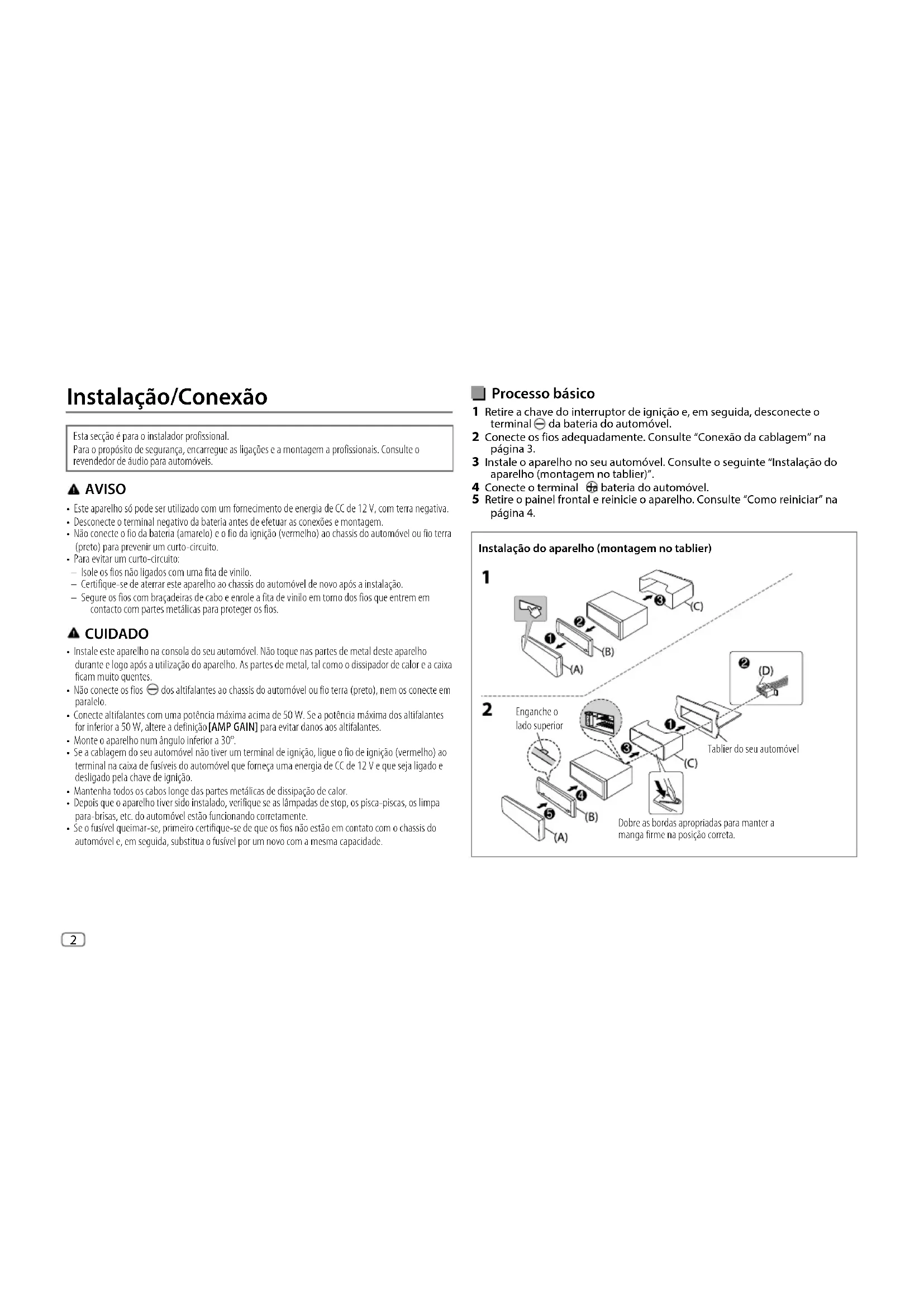 [COLORFLOW01] tot [COLORFLOW03] : De kleur verandert bij de verschillende snelheden. JS_JVC_QSG_KD_X176_E_NL.indd 8JS_JVC_QSG_KD_X176_E_NL.indd 8 1/7/2019 4:16:37 PM1/7/2019 4:16:37 PMJS_JVC_QSG_KD_X176_E_NL.indd 9JS_JVC_QSG_KD_X176_E_NL.indd 9 1/7/2019 4:16:37 PM1/7/2019 4:16:37 PM2 Data Size: B6L (182 mm x 128 mm)Book Size: B6L (182 mm x 128 mm) Processo básico 1 Retire a chave do interruptor de ignição e, em seguida, desconecte o terminal da bateria do automóvel. 2 Conecte os fios adequadamente. Consulte “Conexão da cablagem” na página 3. 3 Instale o aparelho no seu automóvel. Consulte o seguinte “Instalação do aparelho (montagem no tablier)”. 4 Conecte o terminal da bateria do automóvel. 5 Retire o painel frontal e reinicie o aparelho. Consulte “Como reiniciar” na página 4. Instalação do aparelho (montagem no tablier) Tablier Instalação/Conexão Esta secção é para o instalador profissional. Para o propósito de segurança, encarregue as ligações e a montagem a profissionais. Consulte o revendedor de áudio para automóveis. AVISO