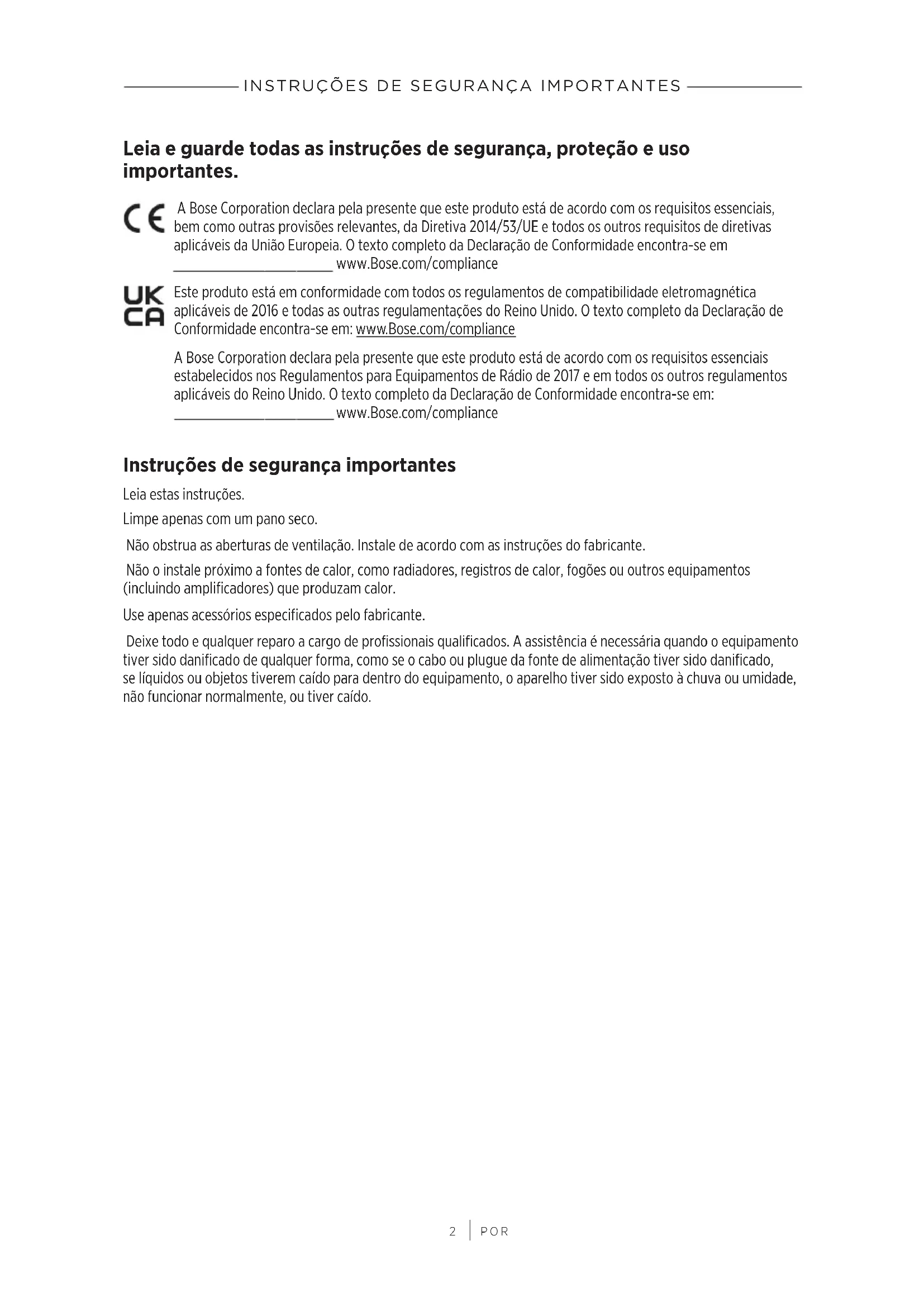 POR Leia e guarde todas as instruções de segurança, proteção e uso importantes. A Bose Corporation declara pela presente que este produto está de acordo com os requisitos essenciais, bemcomo outras provisões relevantes, da Diretiva 2014/53/UE e todos os outros requisitos de diretivas aplicáveis da União Europeia. O texto completo da Declaração de Conformidade encontra-se em www.Bose.com/compliancewww.Bose.com/compliance Este produto está em conformidade com todos os regulamentos de compatibilidade eletromagnética aplicáveis de 2016 e todas as outras regulamentações do Reino Unido. O texto completo da Declaração de Conformidade encontra-se em: www.Bose.com/compliancewww.Bose.com/compliance A Bose Corporation declara pela presente que este produto está de acordo com os requisitos essenciais estabelecidos nos Regulamentos para Equipamentos de Rádio de 2017 e em todos os outros regulamentos aplicáveis do Reino Unido. O texto completo da Declaração de Conformidade encontra-se em: www.Bose.com/compliancewww.Bose.com/compliance Instruções de segurança importantes Leia estas instruções. Limpe apenas com um pano seco. Não obstrua as aberturas de ventilação. Instale de acordo com as instruções do fabricante. Não o instale próximo a fontes de calor, como radiadores, registros de calor, fogões ou outros equipamentos (incluindo amplificadores) que produzam calor. Use apenas acessórios especificados pelo fabricante. Deixe todo e qualquer reparo a cargo de profissionais qualificados. A assistência é necessária quando o equipamento tiver sido danificado de qualquer forma, como se o cabo ou plugue da fonte de alimentação tiver sido danificado, selíquidos ou objetos tiverem caído para dentro do equipamento, o aparelho tiver sido exposto à chuva ou umidade, não funcionar normalmente, ou tiver caído.INSTRUÇÕES DE SEGURANÇA IMPORTANTES