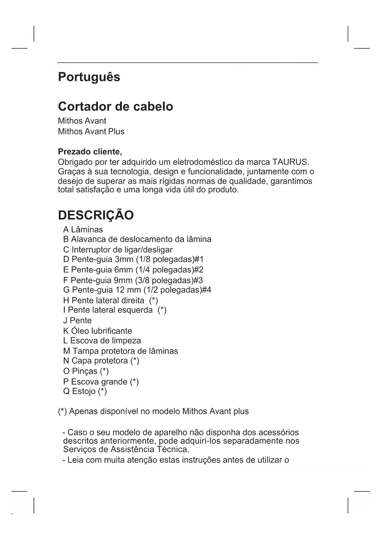 - I materiali di confezionamento dell’apparecchio sono protetti da un sistema di raccolta, classicazione e riciclo (Punto Verde). Per lo smaltimento, utilizzare gli appositi contenitori pubblici, adatti per ogni tipo di materiale. - Il prodotto non contiene sostanze dannose per l’ambiente. Questo simbolo indica che, per smaltire il prodotto al termine della sua durata utile, occorre depositarlo presso un ente di smaltimento autorizzato alla raccolta differenziata di riuti di apparecchiature elettriche ed elettroniche (RAEE). Questo apparecchio rispetta la Direttiva 2014/35/UE di Bassa Ten- sione, la Direttiva 2014/30/UE di Compatibilità Elettromagnetica, la Direttiva 2011/65/UE sui limiti d’impiego di determinate sostanze peri- colose negli apparecchi elettrici ed elettronici e la Direttiva 2009/125/ CE riguardante l’Ecodesign dei prodotti che consumano energia.Português Cortador de cabelo Mithos Avant Mithos Avant Plus Prezado cliente, Obrigado por ter adquirido um eletrodoméstico da marca TAURUS. Graças à sua tecnologia, design e funcionalidade, juntamente com o desejo de superar as mais rígidas normas de qualidade, garantimos total satisfação e uma longa vida útil do produto. DESCRIÇÃO A Lâminas B Alavanca de deslocamento da lâmina C Interruptor de ligar/desligar D Pente-guia 3mm (1/8 polegadas)#1 E Pente-guia 6mm (1/4 polegadas)#2 F Pente-guia 9mm (3/8 polegadas)#3 G Pente-guia 12 mm (1/2 polegadas)#4 H Pente lateral direita (*) I Pente lateral esquerda (*) J Pente K Óleo lubricante L Escova de limpeza M Tampa protetora de lâminas N Capa protetora (*) O Pinças (*) P Escova grande (*) Q Estojo (*) (*) Apenas disponível no modelo Mithos Avant plus - Caso o seu modelo de aparelho não disponha dos acessórios descritos anteriormente, pode adquiri-los separadamente nos Serviços de Assistência Técnica. - Leia com muita atenção estas instruções antes de utilizar oaparelho e guarde-as para futuras consultas. O não cumprimento destas instruções poderá levar a um acidente.