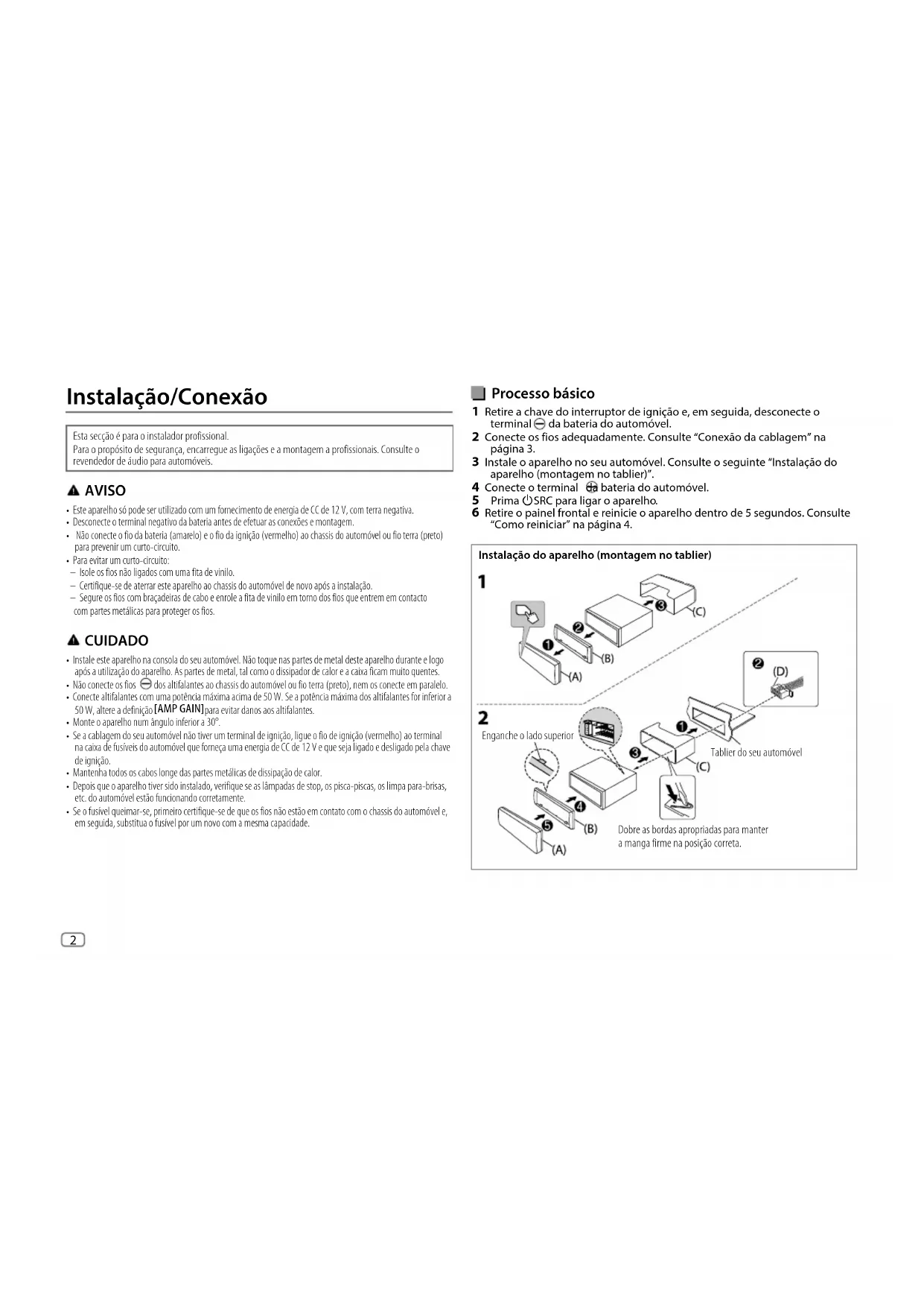JS_JVC_QSG_KD_T812BT_E_NL.indd 9JS_JVC_QSG_KD_T812BT_E_NL.indd 9 24/7/2019 11:48:05 AM24/7/2019 11:48:05 AM2 Data Size: B6L (182 mm x 128 mm)Book Size: B6L (182 mm x 128 mm) Processo básico 1 Retire a chave do interruptor de ignição e, em seguida, desconecte o terminal da bateria do automóvel. 2 Conecte os fios adequadamente. Consulte “Conexão da cablagem” na página 3. 3 Instale o aparelho no seu automóvel. Consulte o seguinte “Instalação do aparelho (montagem no tablier)”. 4 Conecte o terminal da bateria do automóvel. 5 Prima B SRC para ligar o aparelho. 6 Retire o painel frontal e reinicie o aparelho dentro de 5 segundos. Consulte “Como reiniciar” na página 4. Instalação do aparelho (montagem no tablier) Instalação/Conexão Esta secção é para o instalador profissional. Para o propósito de segurança, encarregue as ligações e a montagem a profissionais. Consulte o revendedor de áudio para automóveis. AVISO