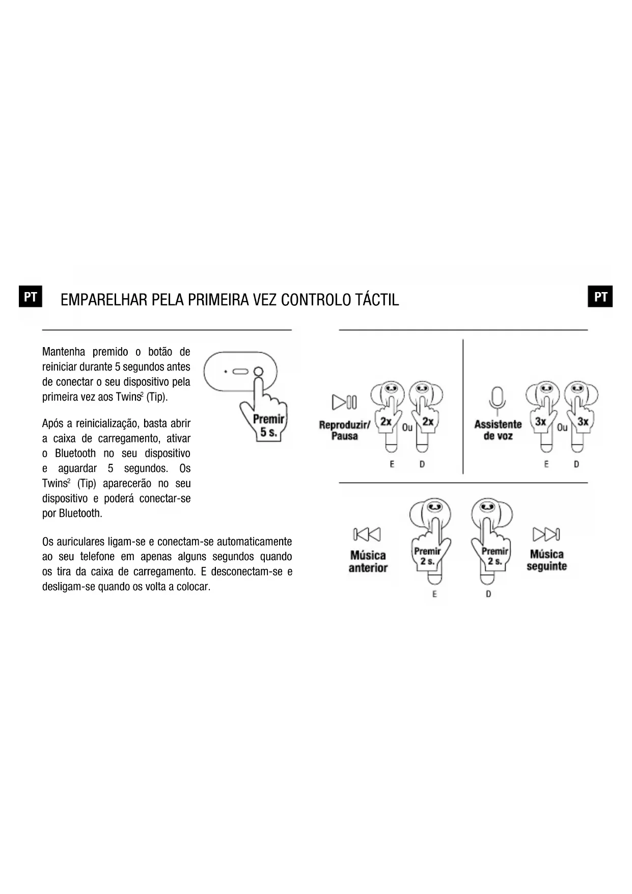 - Vuelva a colocar los auriculares en el estuche de carga, ciérrelo y espere 10 segundos antes de volver a intentarlo. 10 seg. ESPT Os auriculares ligam-se e conectam-se automaticamente ao seu telefone em apenas alguns segundos quando os tira da caixa de carregamento. E desconectam-se e desligam-se quando os volta a colocar. Mantenha premido o botão de reiniciar durante 5 segundos antes de conectar o seu dispositivo pela primeira vez aos Twins