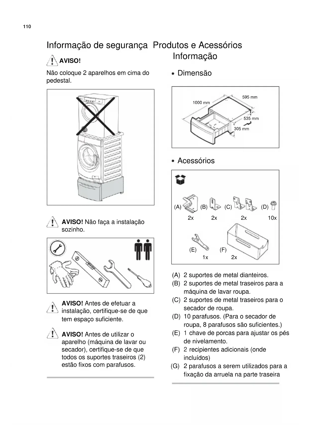 AVISO! Antes de efetuar a instalação, certifique-se de que tem espaço suficiente. AVISO! Antes de utilizar o aparelho (máquina de lavar ou secador), certifique-se de que todos os suportes traseiros (2) estão fixos com parafusos.