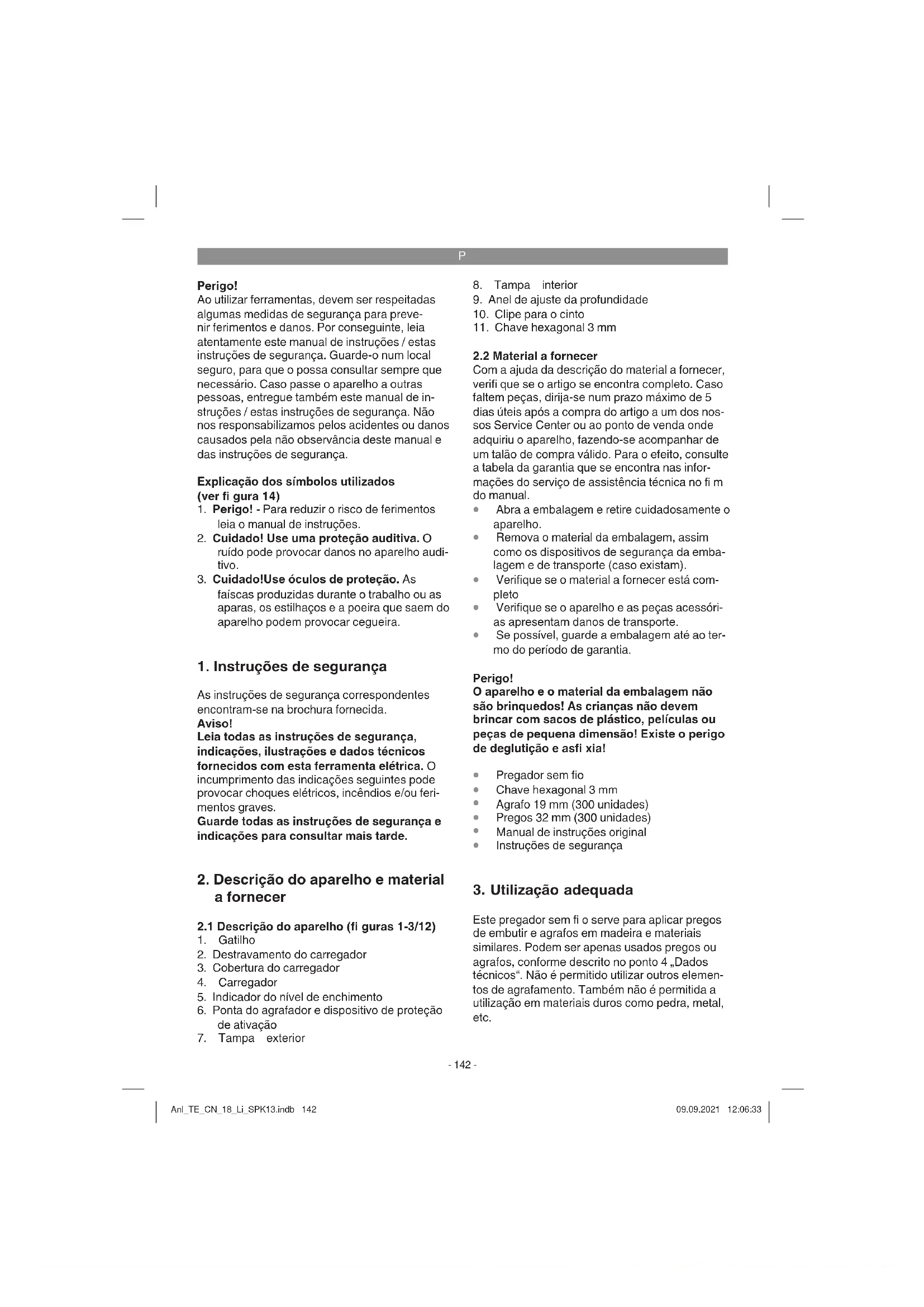 Este pregador sem fi o serve para aplicar pregos de embutir e agrafos em madeira e materiais similares. Podem ser apenas usados pregos ou agrafos, conforme descrito no ponto 4 „Dados técnicos“. Não é permitido utilizar outros elemen- tos de agrafamento. Também não é permitida a utilização em materiais duros como pedra, metal, etc. Anl_TE_CN_18_Li_SPK13.indb 142Anl_TE_CN_18_Li_SPK13.indb 142 09.09.2021 12:06:3309.09.2021 12:06:33P