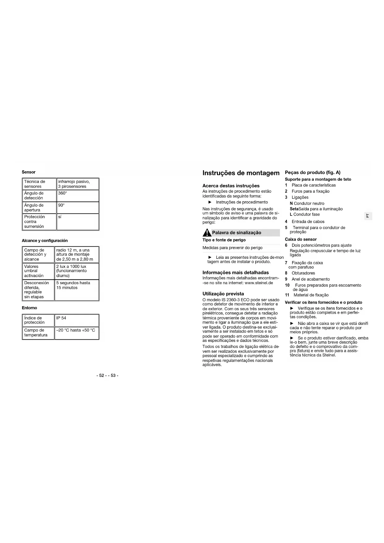 tagem antes de instalar o produto. Informações mais detalhadas Informações mais detalhadas encontram- -se no site na internet: www.steinel.de Utilização prevista O modelo IS 2360-3 ECO pode ser usado como detetor de movimento de interior e de exterior. Com os seus três sensores pirelétricos, consegue detetar a radiação térmica proveniente de corpos em movi