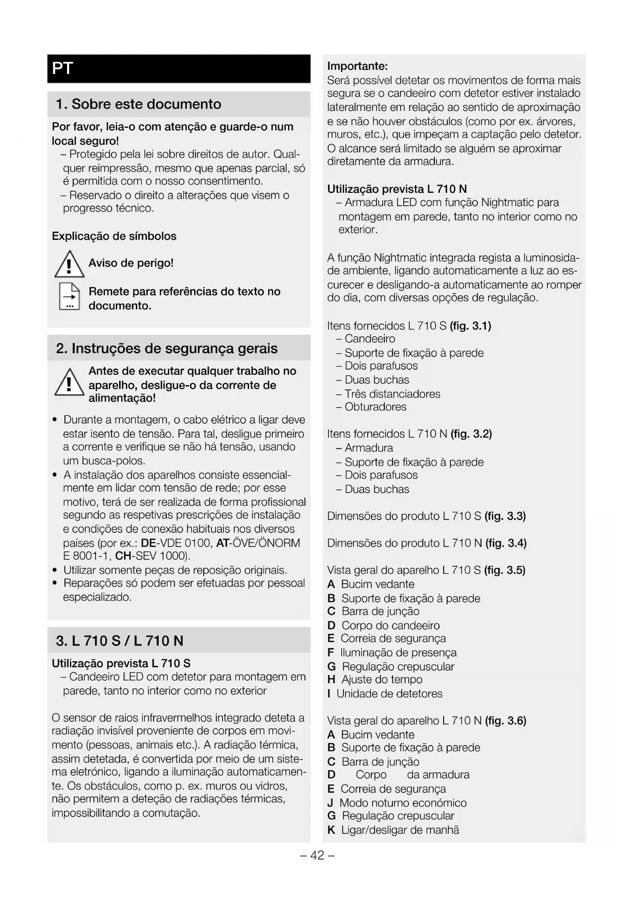 Utilização prevista L 710 S – Candeeiro LED com detetor para montagem em parede, tanto no interior como no exterior O sensor de raios infravermelhos integrado deteta a radiação invisível proveniente de corpos em movi- mento (pessoas, animais etc.). A radiação térmica, assim detetada, é convertida por meio de um siste- ma eletrónico, ligando a iluminação automaticamen- te. Os obstáculos, como p. ex. muros ou vidros, não permitem a deteção de radiações térmicas, impossibilitando a comutação. Importante: Será possível detetar os movimentos de forma mais segura se o candeeiro com detetor estiver instalado lateralmente em relação ao sentido de aproximação e se não houver obstáculos (como por ex. árvores, muros, etc.), que impeçam a captação pelo detetor. O alcance será limitado se alguém se aproximar diretamente da armadura. Utilização prevista L710N – Armadura LED com função Nightmatic para montagem em parede, tanto no interior como no exterior. A função Nightmatic integrada regista a luminosida- de ambiente, ligando automaticamente a luz ao es- curecer e desligando-a automaticamente ao romper do dia, com diversas opções de regulação. Itens fornecidos L710S (fig.3.1) – Candeeiro – Suporte de fixação à parede – Dois parafusos – Duas buchas – Três distanciadores – Obturadores Itens fornecidos L710N (fig.3.2) – Armadura – Suporte de fixação à parede – Dois parafusos – Duas buchas Dimensões do produto L710S (fig.3.3) Dimensões do produto L710N (fig.3.4) Vista geral do aparelho L710S (fig.3.5) A Bucim vedante B Suporte de fixação à parede C Barra de junção D Corpo do candeeiro E Correia de segurança F Iluminação de presença G Regulação crepuscular H Ajuste do tempo I Unidade de detetores Vista geral do aparelho L710N (fig.3.6) A Bucim vedante B Suporte de fixação à parede C Barra de junção D Corpo da armadura E Correia de segurança J Modo noturno económico G Regulação crepuscular K Ligar/desligar de manhã– 43 – Área de deteção L710S (fig.3.7/ 3.8/3.9) Distribuição da intensidade de iluminação (fig.3.10)