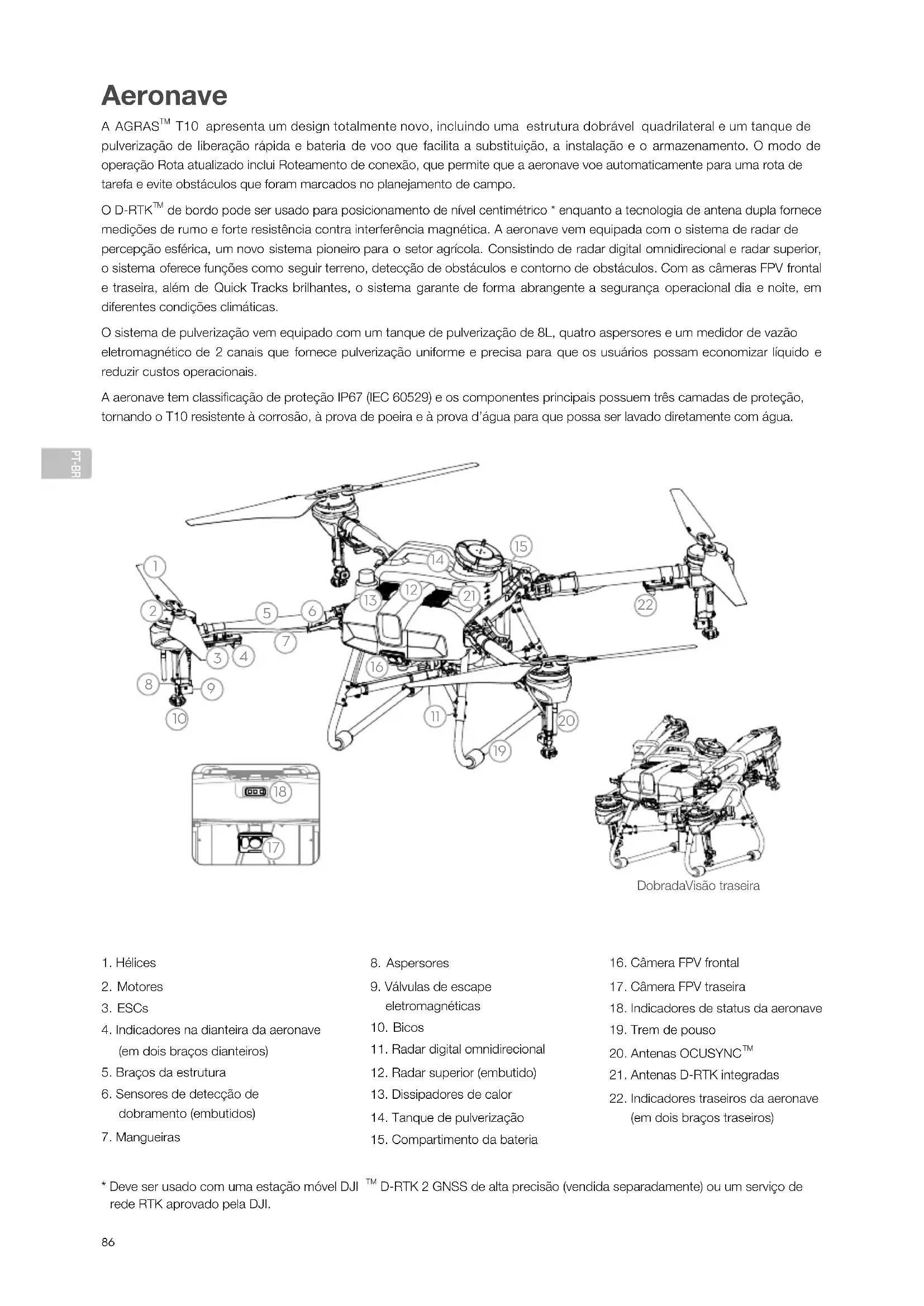 de bordo pode ser usado para posicionamento de nível centimétrico * enquanto a tecnologia de antena dupla fornece medições de rumo e forte resistência contra interferência magnética. A aeronave vem equipada com o sistema de radar de percepção esférica, um novo sistema pioneiro para o setor agrícola. Consistindo de radar digital omnidirecional e radar superior, o sistema oferece funções como seguir terreno, detecção de obstáculos e contorno de obstáculos. Com as câmeras FPV frontal e traseira, além de Quick Tracks brilhantes, o sistema garante de forma abrangente a segurança operacional dia e noite, em diferentes condições climáticas. O sistema de pulverização vem equipado com um tanque de pulverização de 8L, quatro aspersores e um medidor de vazão eletromagnético de 2 canais que fornece pulverização uniforme e precisa para que os usuários possam economizar líquido e reduzir custos operacionais. A aeronave tem classicação de proteção IP67 (IEC 60529) e os componentes principais possuem três camadas de proteção, tornando o T10 resistente à corrosão, à prova de poeira e à prova d’água para que possa ser lavado diretamente com água.