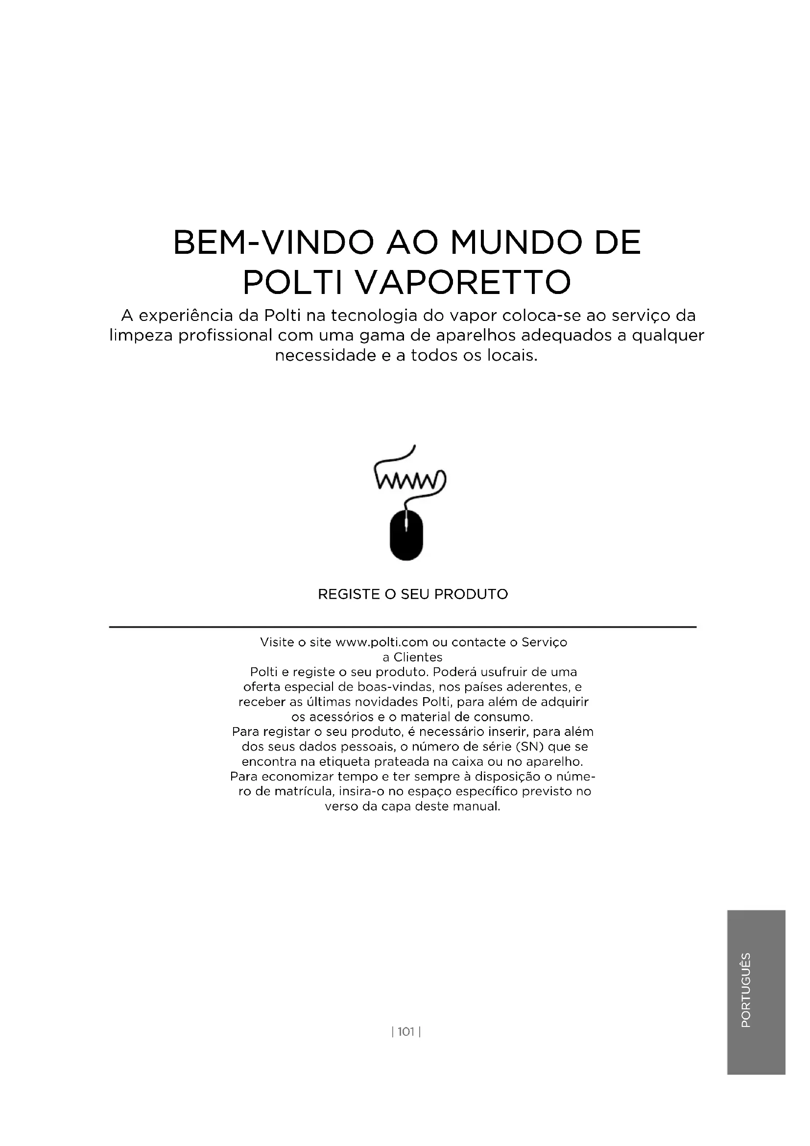 Visite o site www.polti.com ou contacte o Serviço a Clientes Polti e registe o seu produto. Poderá usufruir de uma oferta especial de boas-vindas, nos países aderentes, e receber as últimas novidades Polti, para além de adquirir os acessórios e o material de consumo. Para registar o seu produto, é necessário inserir, para além dos seus dados pessoais, o número de série (SN) que se encontra na etiqueta prateada na caixa ou no aparelho. Para economizar tempo e ter sempre à disposição o núme- ro de matrícula, insira-o no espaço específico previsto no verso da capa deste manual.LEGENDA