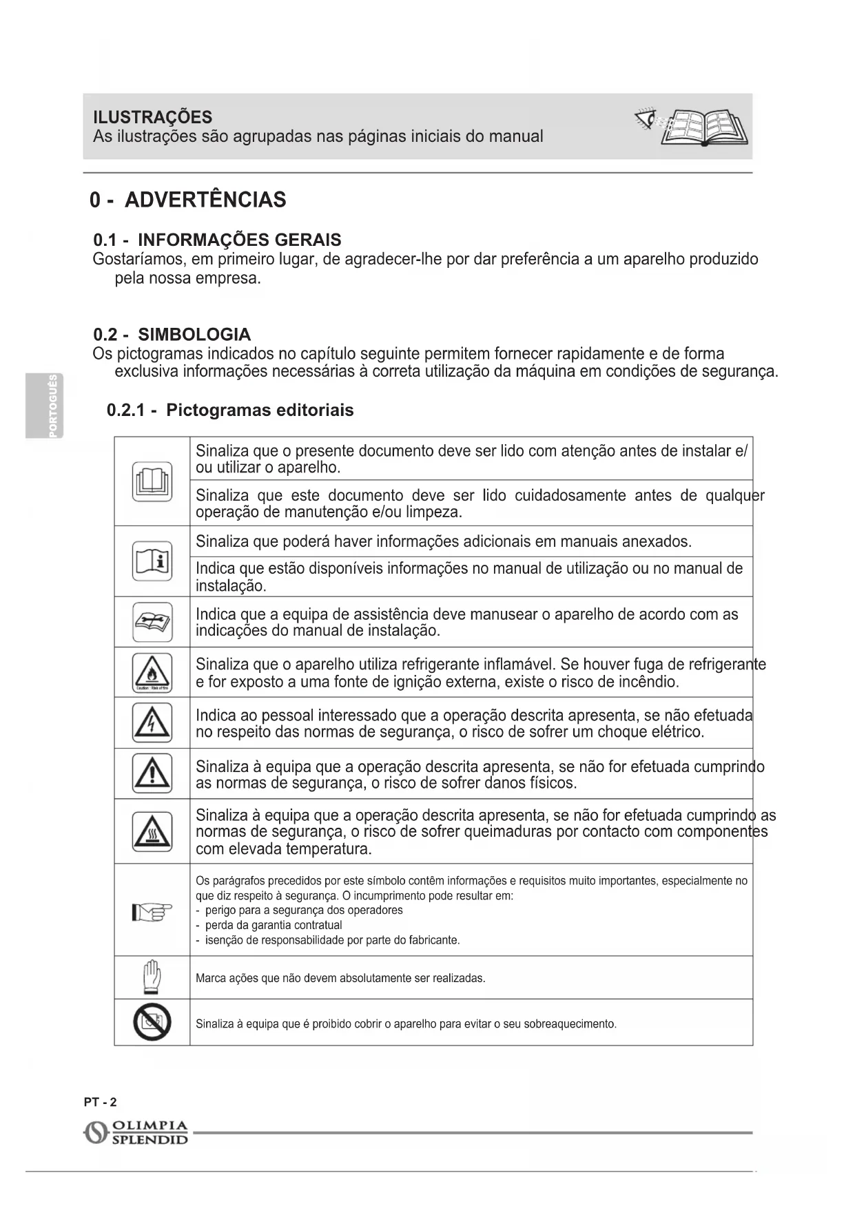 Sinaliza que o presente documento deve ser lido com atenção antes de instalar e/ ou utilizar o aparelho. Sinaliza que este documento deve ser lido cuidadosamente antes de qualquer operação de manutenção e/ou limpeza. Sinaliza que poderá haver informações adicionais em manuais anexados. Indica que estão disponíveis informações no manual de utilização ou no manual de instalação. Indica que a equipa de assistência deve manusear o aparelho de acordo com as indicações do manual de instalação. Sinaliza que o aparelho utiliza refrigerante inamável. Se houver fuga de refrigerante e for exposto a uma fonte de ignição externa, existe o risco de incêndio. Indica ao pessoal interessado que a operação descrita apresenta, se não efetuada no respeito das normas de segurança, o risco de sofrer um choque elétrico. Sinaliza à equipa que a operação descrita apresenta, se não for efetuada cumprindo as normas de segurança, o risco de sofrer danos físicos. Sinaliza à equipa que a operação descrita apresenta, se não for efetuada cumprindo as normas de segurança, o risco de sofrer queimaduras por contacto com componentes com elevada temperatura. Os parágrafos precedidos por este símbolo contêm informações e requisitos muito importantes, especialmente no que diz respeito à segurança. O incumprimento pode resultar em:- perigo para a segurança dos operadores- perda da garantia contratual- isenção de responsabilidade por parte do fabricante.Marca ações que não devem absolutamente ser realizadas.Sinaliza à equipa que é proibido cobrir o aparelho para evitar o seu sobreaquecimento. ILUSTRAÇÕES As ilustrações são agrupadas nas páginas iniciais do manualAQUARIA S1 10/12/14/16 P PT - 3 PORTOGUÊS