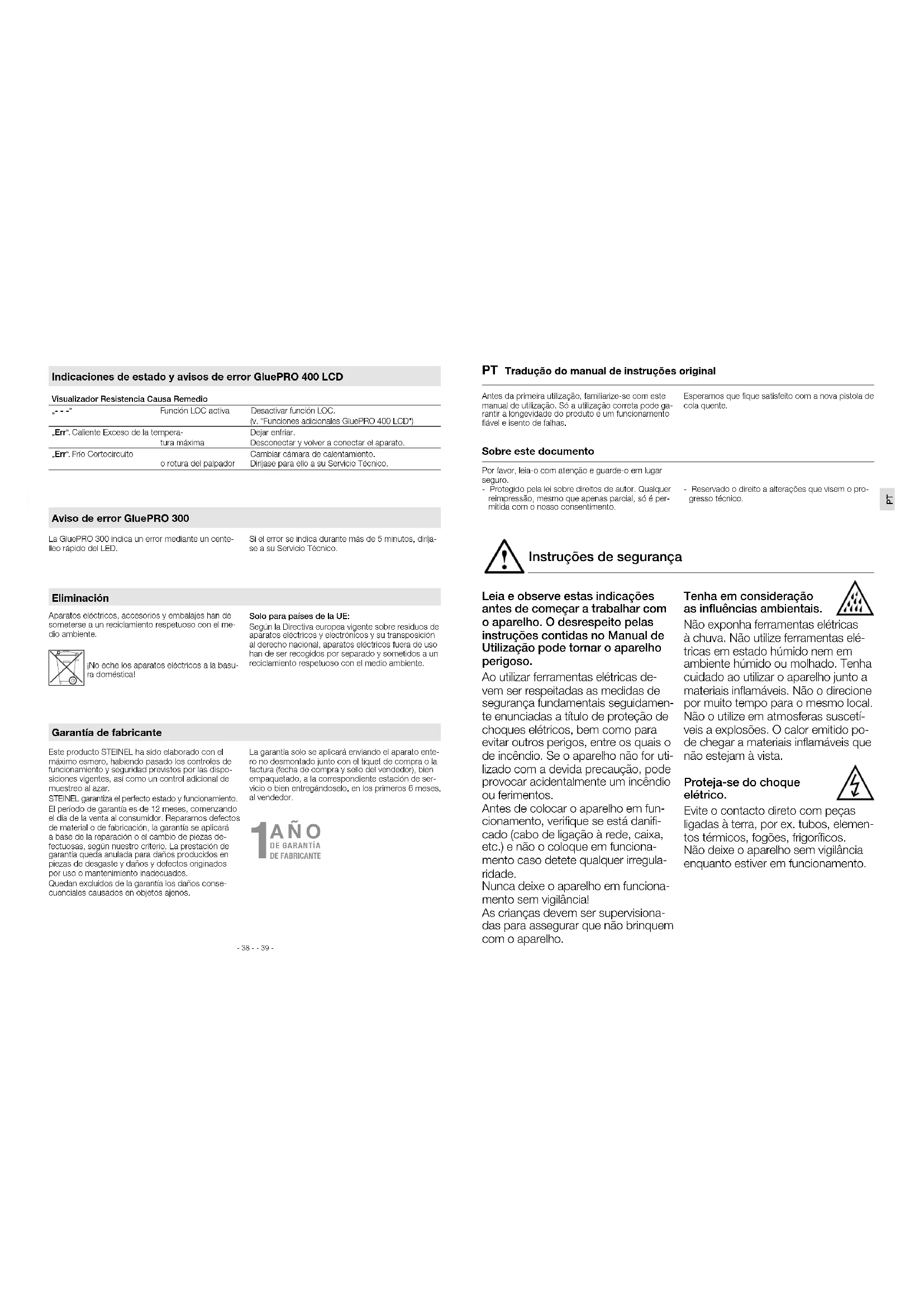 - dependendo da temperatura e da viscosidade da cola ** em modo de 30s de colagem / 60s de intervalo- 44 - - 45 - Garantia do fabricanteEste produto STEINEL foi fabricado com todo o zelo e o seu funcionamento e segurança verificados, de acordo com as normas em vigor, e sujeito a um con-trolo por amostragem aleatória.A STEINEL garante o bom estado e o bom funciona-mento do aparelho.O prazo de garantia é de 12meses a contar da data de compra. Damos garantia a falhas relacionadas com defeitos de material ou de fabrico. A garantia inclui a reparação ou a substituição das peças com defeito, de acordo com o nosso critério, estando ex-cluídas as peças sujeitas a desgaste, os danos e as falhas originados por uma utilização ou manutenção incorreta.Excluem-se igualmente os danos provocados noutros objetos estranhos ao aparelho.Os serviços previstos na garantia só serão prestados caso o aparelho seja apresentado bem embalado no respetivo serviço de assistência técnica ou, nos primeiros 6 meses, junto do revendedor, devida- mente montado e acompanhado da fatura (data da compra e carimbo do revendedor). GARANTIA