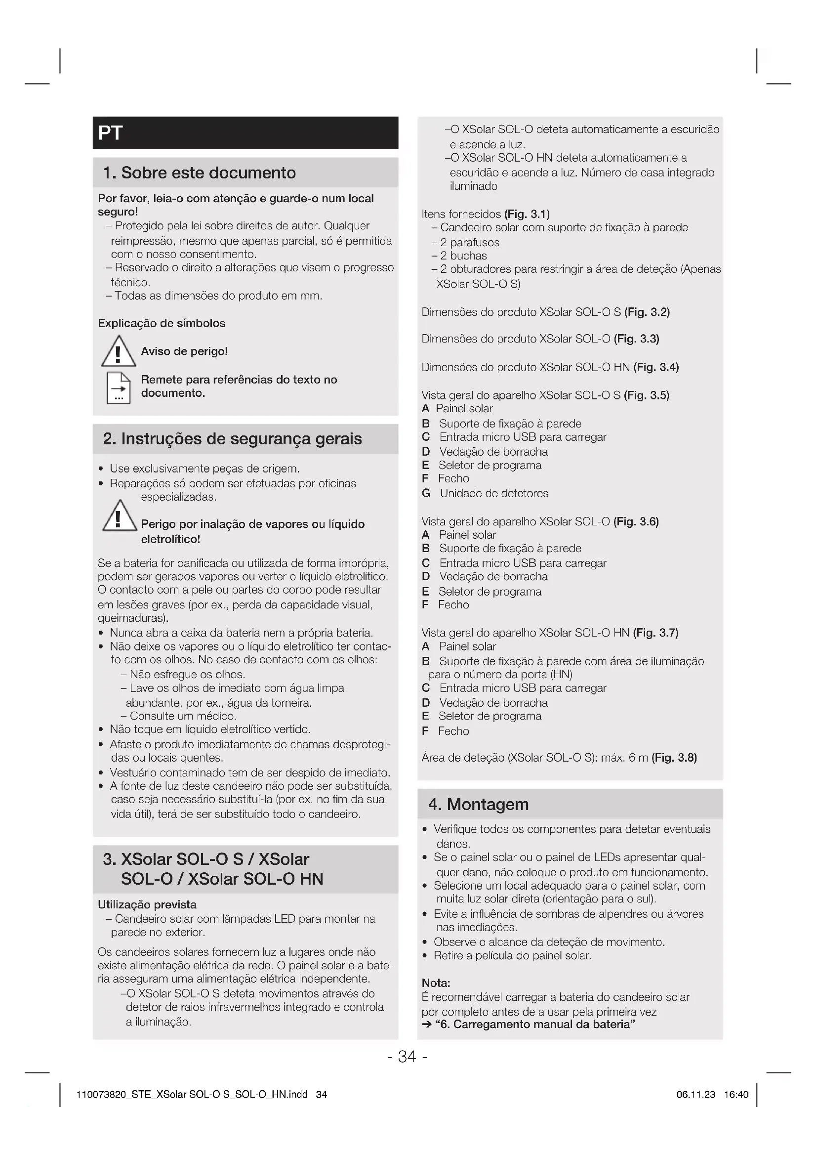 SOL-O/XSolar SOL-O HN Utilização prevista – Candeeiro solar com lâmpadas LED para montar na parede no exterior. Os candeeiros solares fornecem luz a lugares onde não existe alimentação elétrica da rede. O painel solar e a bate- ria asseguram uma alimentação elétrica independente. – O XSolar SOL-O S deteta movimentos através do detetor de raios infravermelhos integrado e controla a iluminação.