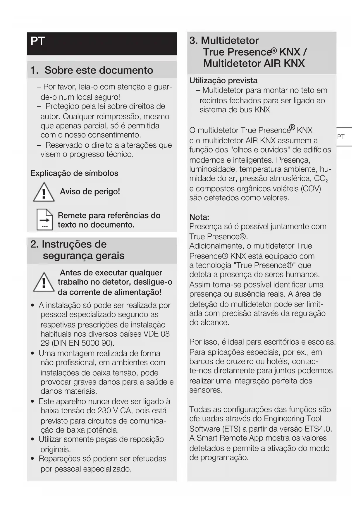 KNX e o multidetetor AIR KNX assumem a função dos "olhos e ouvidos" de edifícios modernos e inteligentes. Presença, luminosidade, temperatura ambiente, hu- midade do ar, pressão atmosférica, CO₂ e compostos orgânicos voláteis (COV) são detetados como valores. Nota: Presença só é possível juntamente com True Presence®. Adicionalmente, o multidetetor True Presence® KNX está equipado com a tecnologia "True Presence®" que deteta a presença de seres humanos. Assim torna-se possível identificar uma presença ou ausência reais. A área de deteção do multidetetor pode ser limit- ada com precisão através da regulação do alcance. Por isso, é ideal para escritórios e escolas. Para aplicações especiais, por ex., em barcos de cruzeiro ou hotéis, contac- te-nos diretamente para juntos podermos realizar uma integração perfeita dos sensores. Todas as configurações das funções são efetuadas através do Engineering Tool Software (ETS) a partir da versão ETS4.0. A Smart Remote App mostra os valores detetados e permite a ativação do modo de programação. PT– 48 –