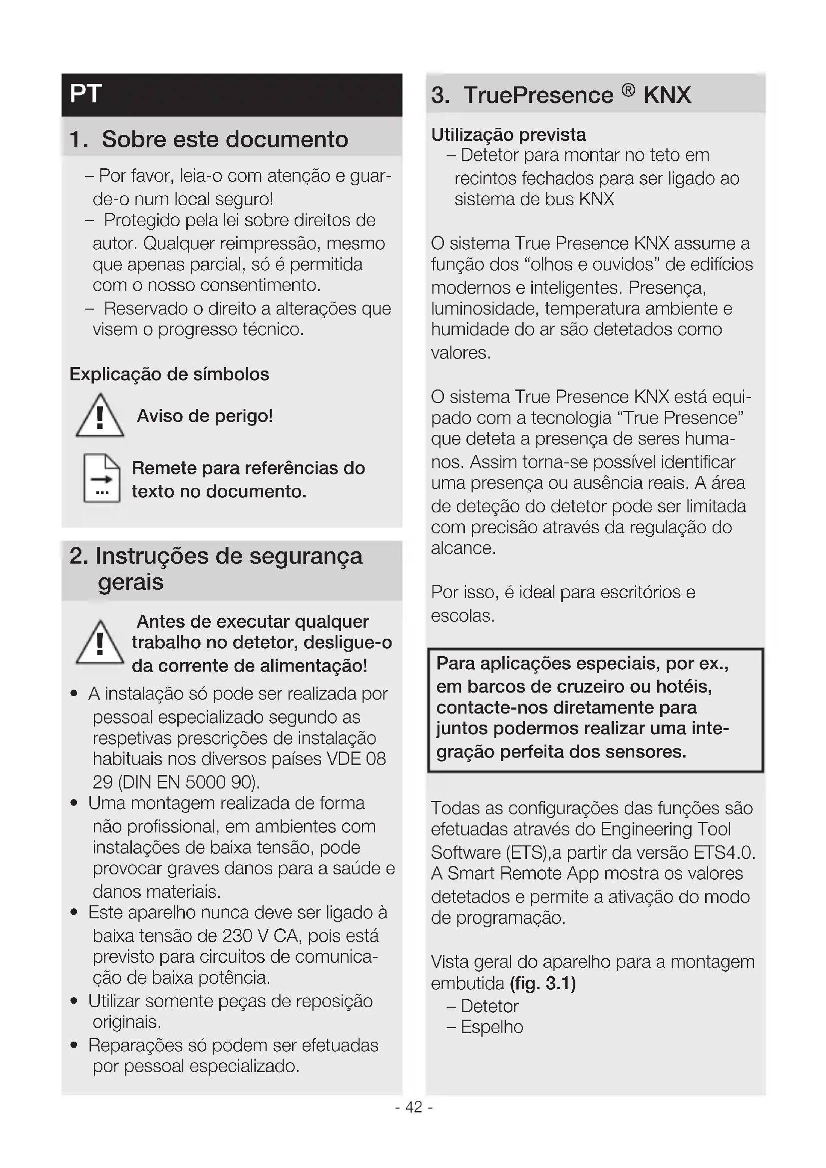 DO FABRICANTE GARANTIA ANOS DO FABRICANTE GARANTIA ANOS DO FABRICANTE PT- 46 - Dimensões (L×A×P em mm) Embutido: 103×103×32 De superfície: 119×119×33 Consumo de corrente 30mA Tensão de alimentação Tensão bus KNX, 21-30V Altura de montagem 2-12m Área de deteção 360° Alcance Ø 9m True Presence (até altura de montagem máx. de 4m) Ø 15m presença Ø 15m movimento (ajustável com precisão de um centímetro) Valores detetados True Presence Medição da luz Temperatura: 0-40°C Humidade relativa do ar: 0-100% Saídas 4× saídas de luz (ON/OFF, valor de intensidade regulada, Scene) Valor de intensidade regulada com luz de acentuação 2× iluminação constante com iluminação de presença, aquecimento/ventilação/climatização, presença, temperatura, humidade relativa do ar, ponto de orvalho, grelha lógica, conforto, antipresença Ajuste do tempo 30 segundos até 18:12:15 horas (hh:mm:ss), modo IQ Regulação crepuscular 2-1000 lux Intervalo de temperatura 0°C a +40°C Grau de proteção IP 20 Frequência True Presence 7,2GHz (reage a micromovimentos das funções vitais) Potência emissora UWB ≤ -41dBm/MHz Frequência Bluetooth 2,4-2,48GHz Potência emissora Bluetooth 5 dBm/3 mW 12 Dados técnicos- 46 - - 47 - 13 Falhas de funcionamento