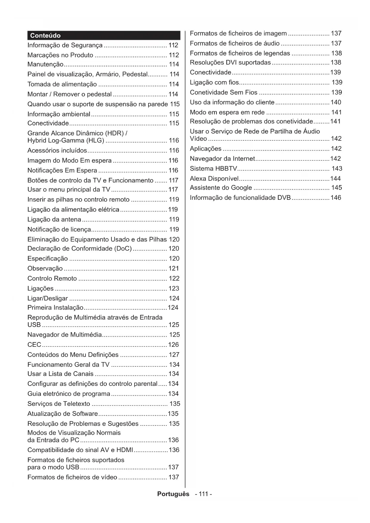 nel_name" on ‘FN’ A TV muda para o canal com o nome especicado channel up on ‘FN’ A TV muda para o canal imediatamente superior, se algum disponível channel down on ‘FN’ A TV muda para o canal imediatamente inferior, se algum disponível FN é a abreviatura para ‘Nome Amigável’. Google é uma marca comercial de Google LLC. Informação de funcionalidade DVB Este receptor DVB é apenas adequado para usar no país para o qual foi destinado a ser usado. Apesar deste receptor DVB estar conforme as últimas especificações DVB no momento da sua produção, não podemos garantir compatibilidade com futuras transmissões DBV devido a alterações que possam ser implementadas nos sinais de difusão e tecnologias. Algumas funções digitais da televisão podem não estar disponíveis em todos os países. Estamos comprometidos em melhorar os nossos produtos; portanto as especificações podem ser alteradas sem aviso prévio. Para aconselhamento sobre onde comprar acessórios, deve contactar o estabelecimento onde adquiriu o seu equipamento.