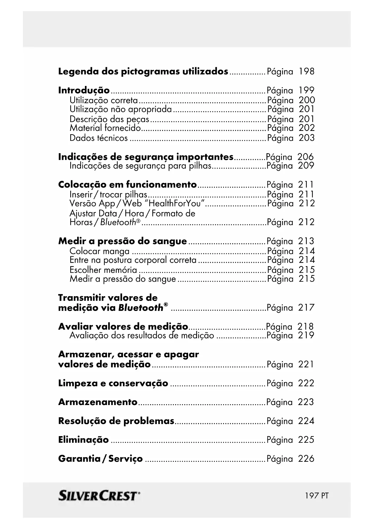 word mark and logos are registered trademarks owned by Bluetooth SIG, Inc. and any use of such marks by Hans Dinslage GmbH is under license. Other trademarks and trade names are those of their respective owners. Apple and the Apple logo are trademarks of Apple Inc., registered in the U.S. and other countries. App Store is a service mark of Apple Inc., registered in the U.S. and other countries. Google Play and the Google Play logo are trademarks of Google LLC. Android is a trademark of Google LLC. 749.164_SBM67-H4Y_2018-05-09_01_IM_Lidl_LB8_OS197 PT Legenda dos pictogramas utilizados ................ Página 198 Introdução .................................................................... Página 199 Utilização correta ........................................................ Página 200 Utilização não apropriada ......................................... Página 201 Descrição das peças ................................................... Página 201 Material fornecido .......................................................Página 202 Dados técnicos ............................................................Página 203 Indicações de segurança importantes ..............Página 206 Indicações de segurança para pilhas ........................Página 209 Colocação em funcionamento ..............................Página 211 Inserir / trocar pilhas .................................................... Página 211 Versão App / Web “HealthForYou”...........................Página 212 Ajustar Data / Hora / Formato de Horas / Bluetooth