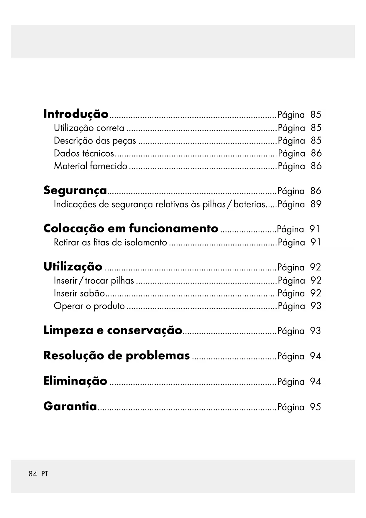 Compartimento de pilhas86 PT Dados técnicos Pilhas: 4 x 1,5 V (corrente contínua), AAA/ LR03 (faz parte da entrega) Volume máximo: cerca de 330 ml Material fornecido 1 Sensor do dispensador de sabão 4 Pilhas 1 Manual de instruções Segurança