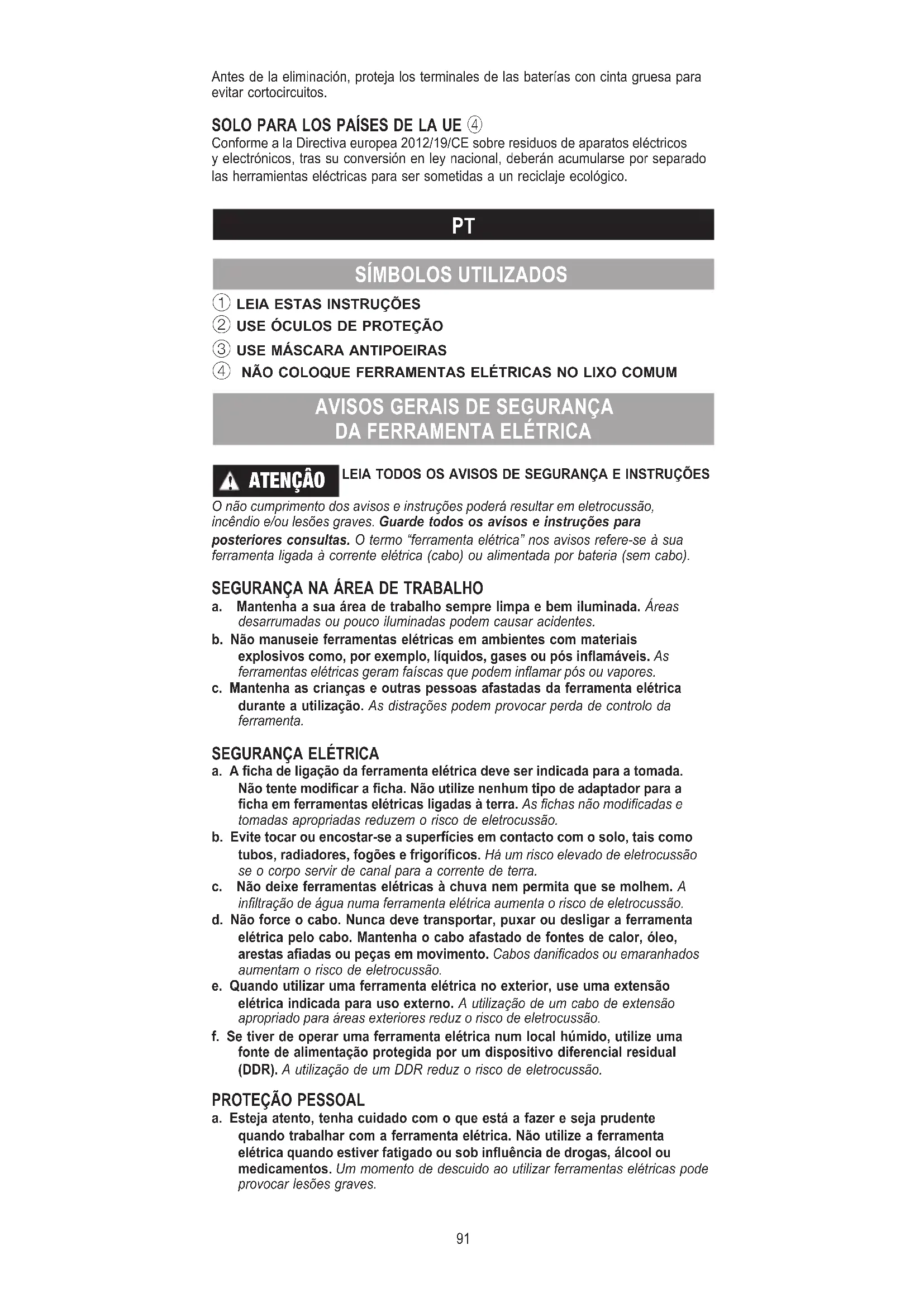 ATENÇÂO LEIA TODOS OS AVISOS DE SEGURANÇA E INSTRUÇÕES O não cumprimento dos avisos e instruções poderá resultar em eletrocussão, incêndio e/ou lesões graves. Guarde todos os avisos e instruções para posteriores consultas. O termo “ferramenta elétrica” nos avisos refere-se à sua ferramenta ligada à corrente elétrica (cabo) ou alimentada por bateria (sem cabo).
