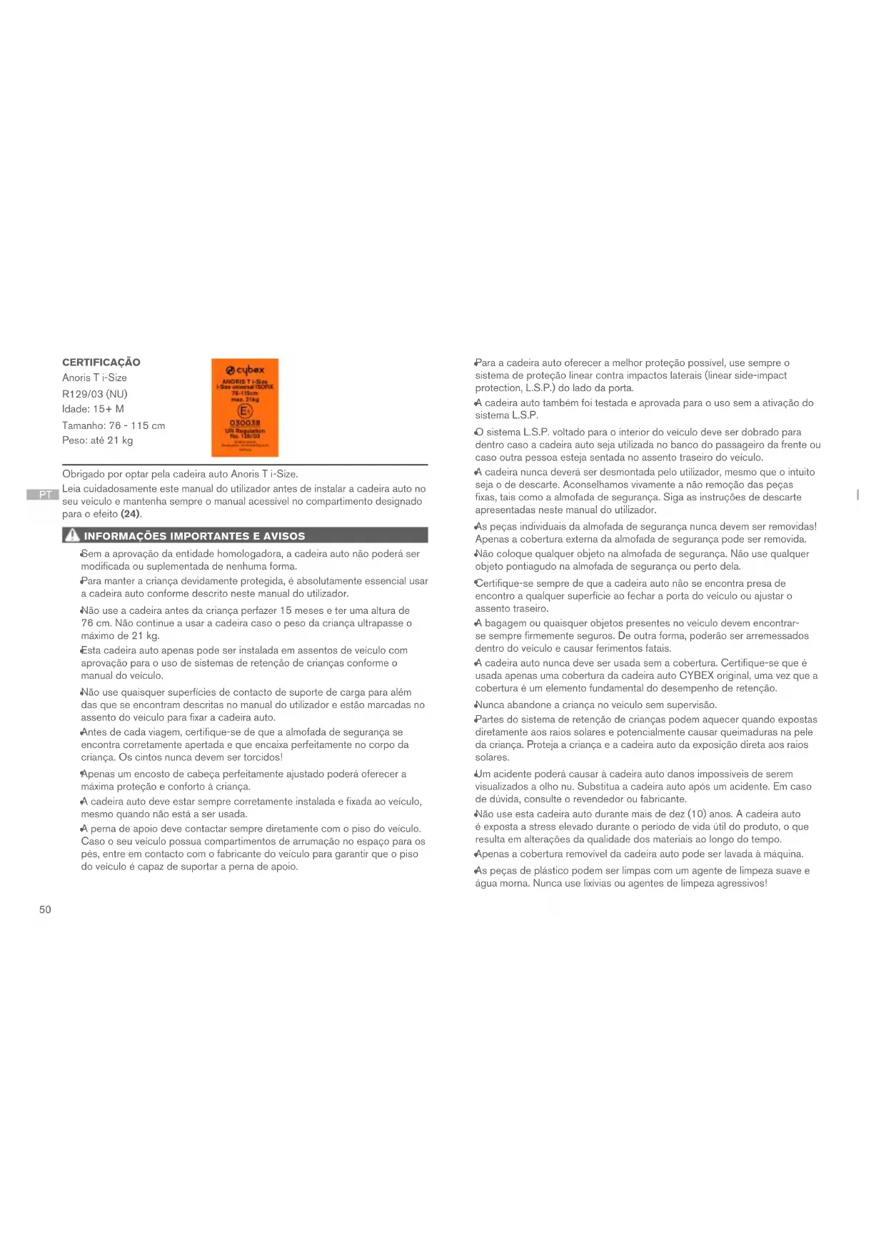 Este sistema de retenção de crianças aperfeiçoado é i-Size. Encontra-se aprovado em conformidade com o Regulamento da Comissão Económica das Nações Unidas para a Europa n.º R129/03 para o uso em lugares sentados dos veículos compatíveis com o i-Size, conforme indicado por fabricantes de veículos nos respetivos manuais do utilizador. Caso o seu veículo não tenha um lugar sentado compatível com o i-Size, verifique a lista de tipologias de veículos incluída em anexo para saber se o uso é permitido. Poderá obter a versão atualizada mais recente da lista de tipologias no site www.cybex-online.com. Caso o seu veículo não esteja equipado com ISOFIX, a cadeira auto não pode ser usada. Caso o seu veículo não tenha espaço suficiente, o sistema L.S.P. pode ser rebatido. O uso de todas as posições de reclinação em todos os veículos aprovados não pode ser garantido.