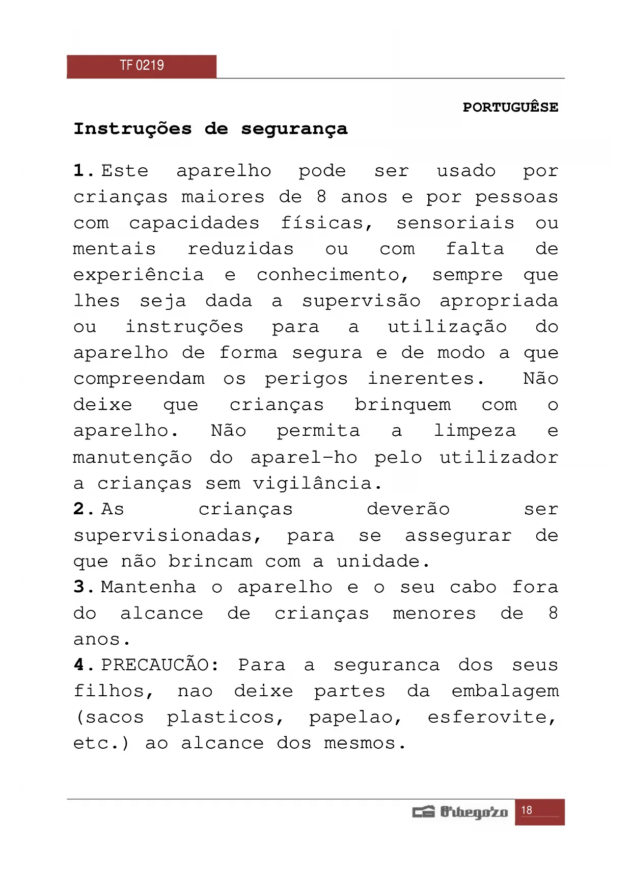 - Para proteger as crianças dos perigos relacionados com aparelhos eléctricos,TF 0219