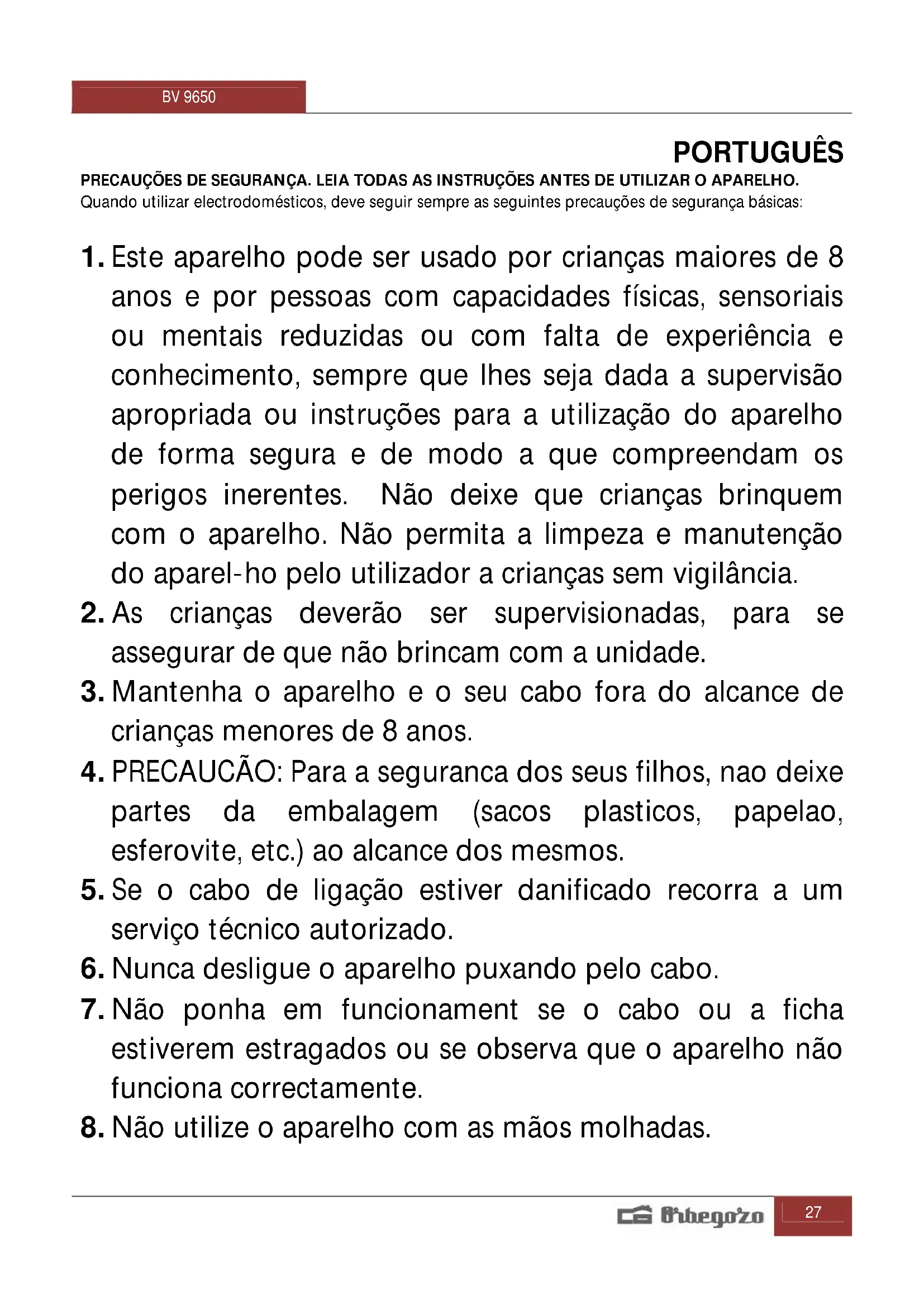 MANUAL DE UTILIZADOR BV 9650 Orbegozo