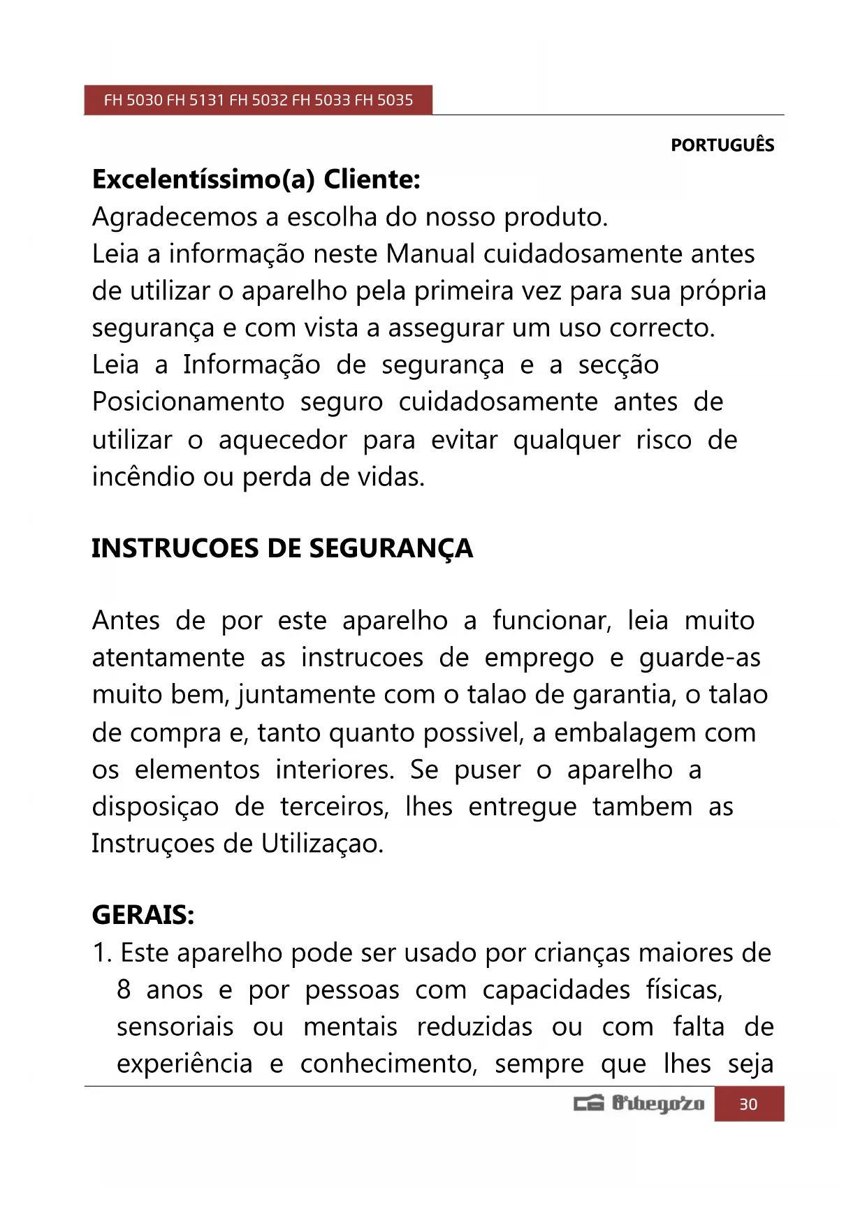 A diretiva Européia 2012/19/EU referente à gestão de resíduos de aparelhos elétricos e eletrônicos (RAEE), prevê que os eletrodomésticos não devem ser escoados no fluxo normal dos resíduos sólidos urbanos. Os aparelhos desatualizados devem ser recolhidos separadamente para otimizar a taxa de recuperação e reciclagem dos materiais que os compõem e impedir potenciais danos para a saúde humana e para o ambiente. O símbolo constituído por um contendor de lixo barrado com uma cruz deve ser colocado em todos os produtos por forma a recordar a obrigatoriedade de recolha separada. Os consumidores devem contatar as autoridades locais ou os pontos de venda para solicitar informação referente ao local apropriado onde devem depositar os eletrodomésticos velhos. DECLARAÇÃO DE CONFORMIDADE: Este dispositivo está em conformidade com as exigências da Directiva de Baixa Tensão 2014/35/EU e os requisitos da diretiva EMC 2014/30/EU. GARANTIA Este aparelho está coberto e tem direito à garantia legal de acordo com a legislação em vigor a partir da data de compra. Guarde o recibo de compra para poder reclamar o seu direito à garantia. Para encontrar o serviço mais próximo de sua localização, entre em contato através do seguinte link da web: https://orbegozo.com/assistencia- tecnica/ Para qualquer tipo de consulta, dúvida ou incidente, pode contatar-nos através do nosso e-mail apresentado na página principal deste manual ou através do nosso serviço de assistência técnica em https://orbegozo.com/contacto/ Orbegozo não se responsabiliza por componentes e acessórios que estejam sujeitos a desgaste devido ao uso, bem como compostos perecíveis ou deteriorados por uso indevido. Também não será responsável se o proprietário tiver modificado tecnicamente o dispositivo. Verifique as condições legais no nosso site.FH 5030 FH 5131 FH 5032 FH 5033 FH 5035